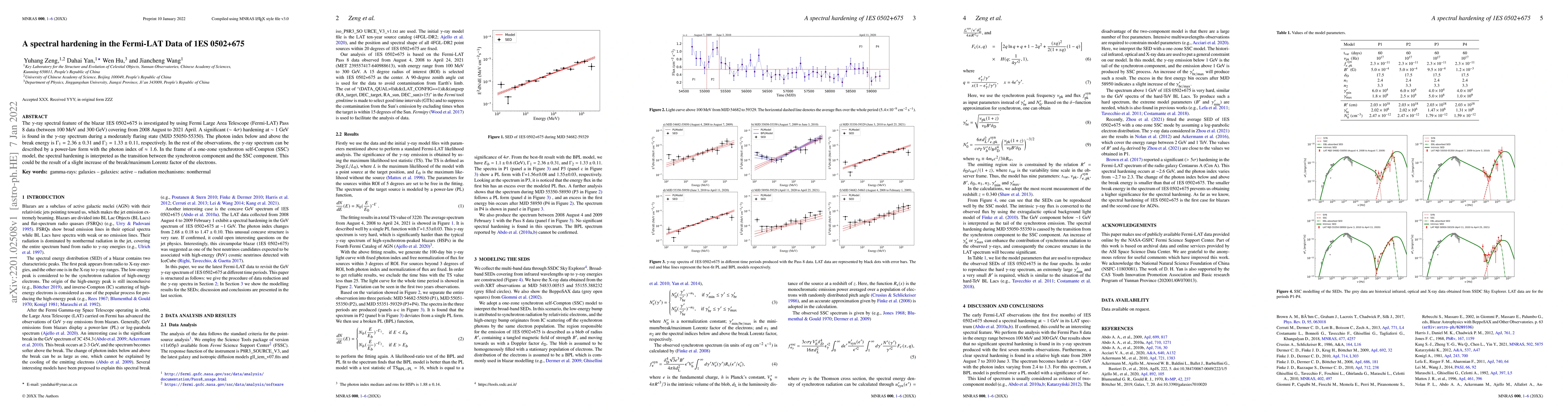 The research analyzes Fermi-LAT data of blazar 1ES 0502+675, 2008-2021, identifying a significant spectral hardening around 1 GeV during a moderate flaring period. This hardening is interpreted as a shift in the electron energy distribution in a one-zone SSC model.