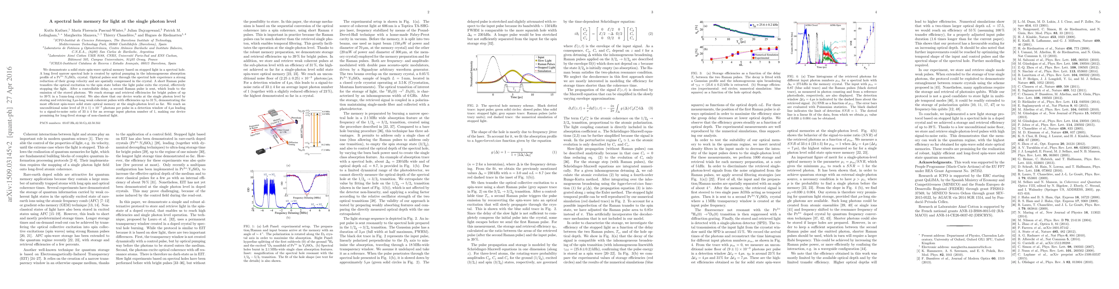 This paper demonstrates a solid-state spin-wave optical memory that stores light at the single-photon level using a spectral hole in a Pr$^{3+}$:Y$_2$SiO$_5$ crystal, achieving up to 39% efficiency for bright pulses and 31% for single photons, with a low noise level and high signal-to-noise ratio.