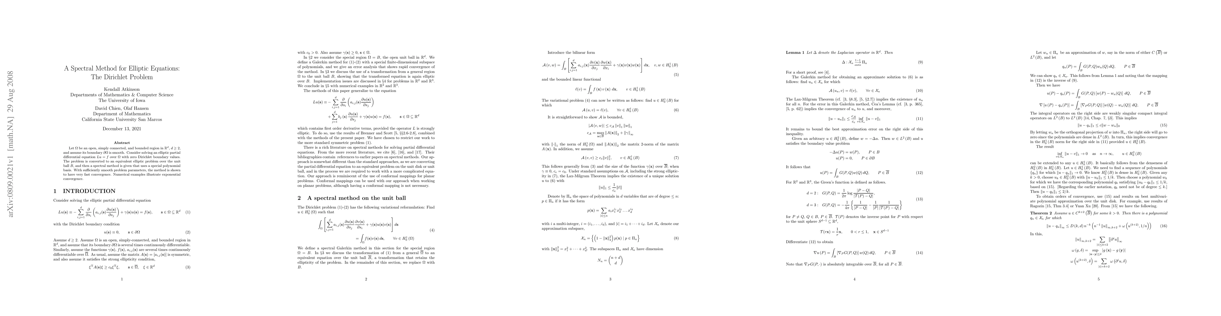 This paper proposes a spectral method for solving elliptic partial differential equations with Dirichlet boundary conditions, reformulating the problem on the unit ball and applying a spectral Galerkin method using multivariate polynomials. The method demonstrates superalgebraic convergence rates and is illustrated with numerical examples in two and three dimensions.