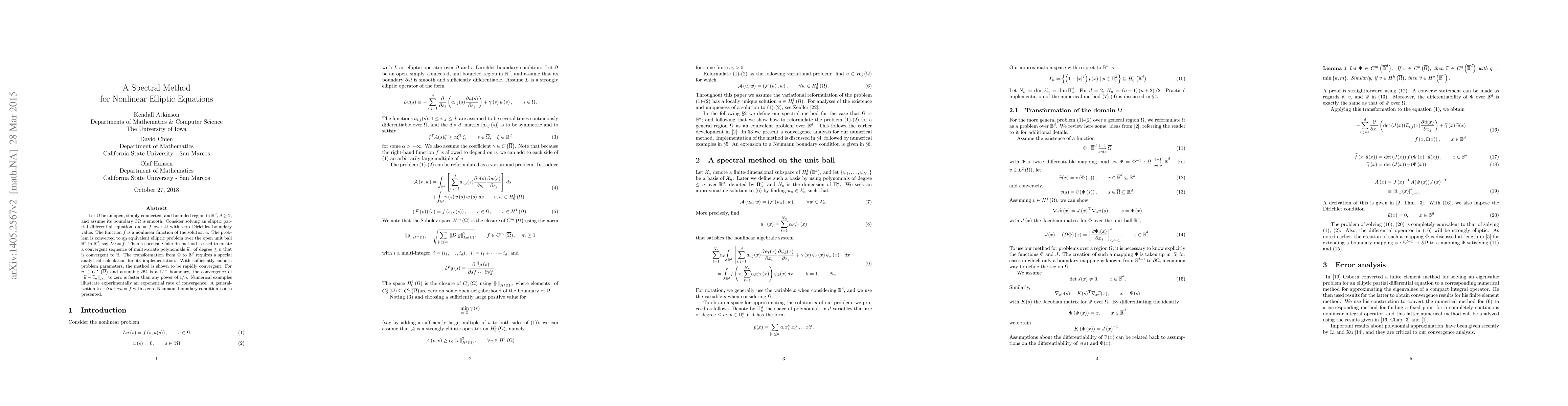 A spectral method is used to solve nonlinear elliptic equations with a conversion to an equivalent elliptic problem over the unit ball, achieving rapid convergence with an exponential rate of convergence in numerical examples.