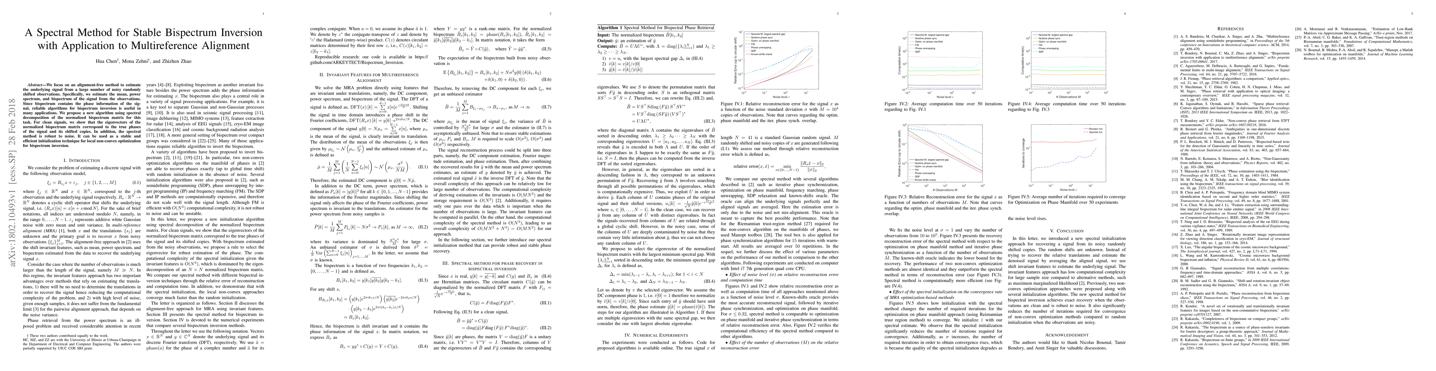 We focus on an alignment-free method to estimate the underlying signal from a large number of noisy randomly shifted observations. Specifically, we estimate the mean, power spectrum, and bispectrum of the signal from the observations. Since bispectrum contains the phase information of the signal, reliable algorithms for bispectrum inversion is useful in many applications. We propose a new algorithm using spectral decomposition of the normalized bispectrum matrix for this task. For clean signals, we show that the eigenvectors of the normalized bispectrum matrix correspond to the true phases of the signal and its shifted copies. In addition, the spectral method is robust to noise. It can be used as a stable and efficient initialization technique for local non-convex optimization for bispectrum inversion.