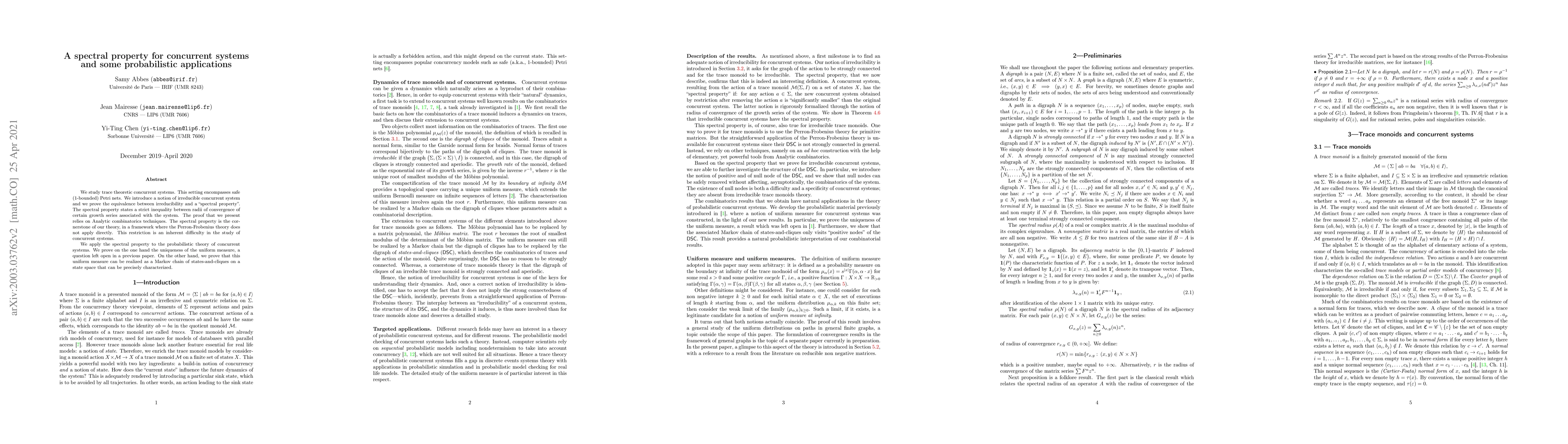 This paper introduces a spectral property for concurrent systems, particularly safe Petri nets, establishing equivalence with system irreducibility via analytic combinatorics. It applies this property to probabilistic concurrent systems, proving the uniqueness of the uniform measure and its realization as a Markov chain.