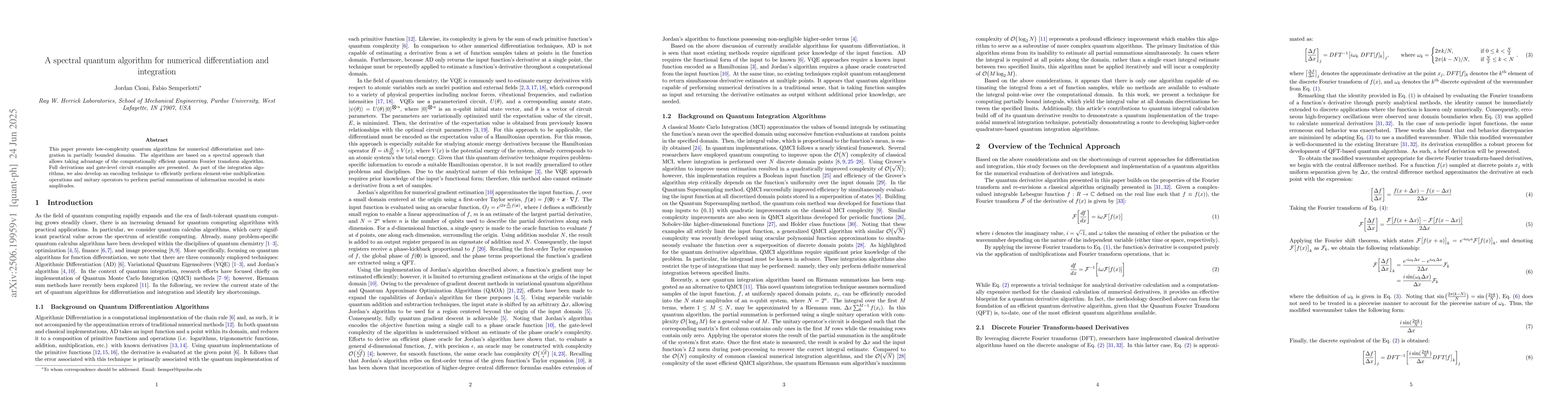 This paper presents low-complexity quantum algorithms for numerical differentiation and integration in partially bounded domains. The algorithms are based on a spectral approach that allows taking advantage of the computationally efficient quantum Fourier transform algorithm. Full derivations and gate-level circuit examples are presented. As part of the integration algorithms, we also develop an encoding technique to efficiently perform element-wise multiplication operations and unitary operators to perform partial summations of information encoded in state amplitudes.