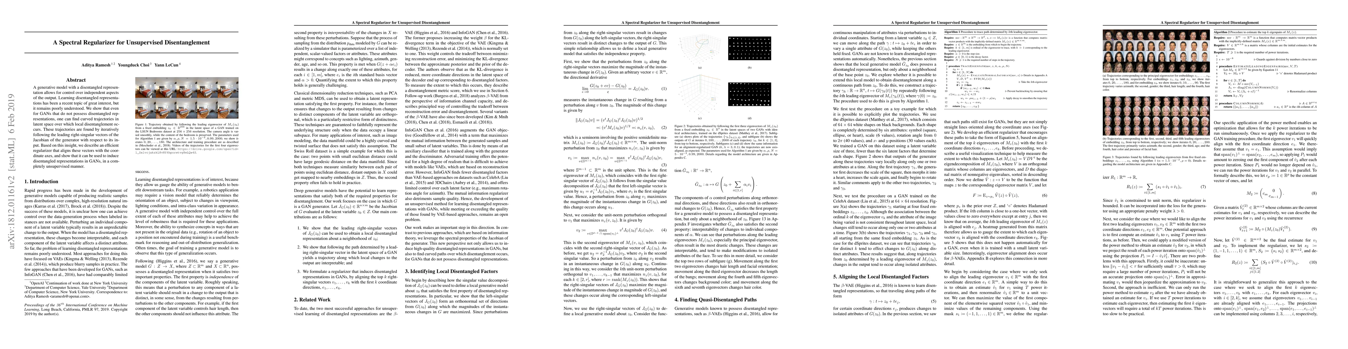 A generative model with a disentangled representation allows for independent control over different aspects of the output. Learning disentangled representations has been a recent topic of great interest, but it remains poorly understood. We show that even for GANs that do not possess disentangled representations, one can find curved trajectories in latent space over which local disentanglement occurs. These trajectories are found by iteratively following the leading right-singular vectors of the Jacobian of the generator with respect to its input. Based on this insight, we describe an efficient regularizer that aligns these vectors with the coordinate axes, and show that it can be used to induce disentangled representations in GANs, in a completely unsupervised manner.