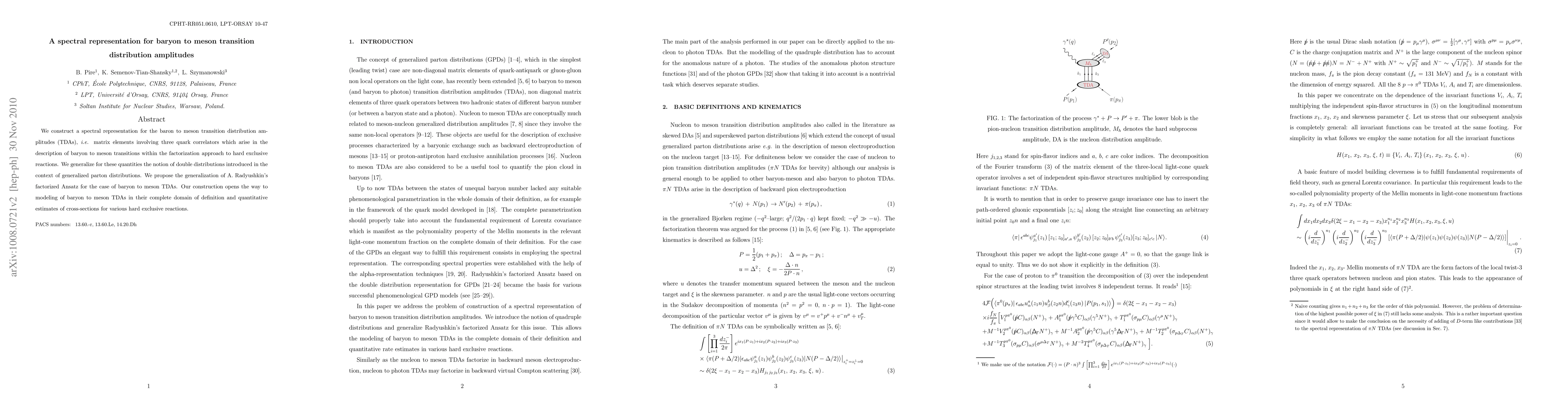 This paper constructs a spectral representation for baryon to meson transition distribution amplitudes, generalizing the notion of double distributions and Radyushkin's factorized Ansatz. This approach enables modeling and quantitative estimates of cross-sections for hard exclusive reactions.