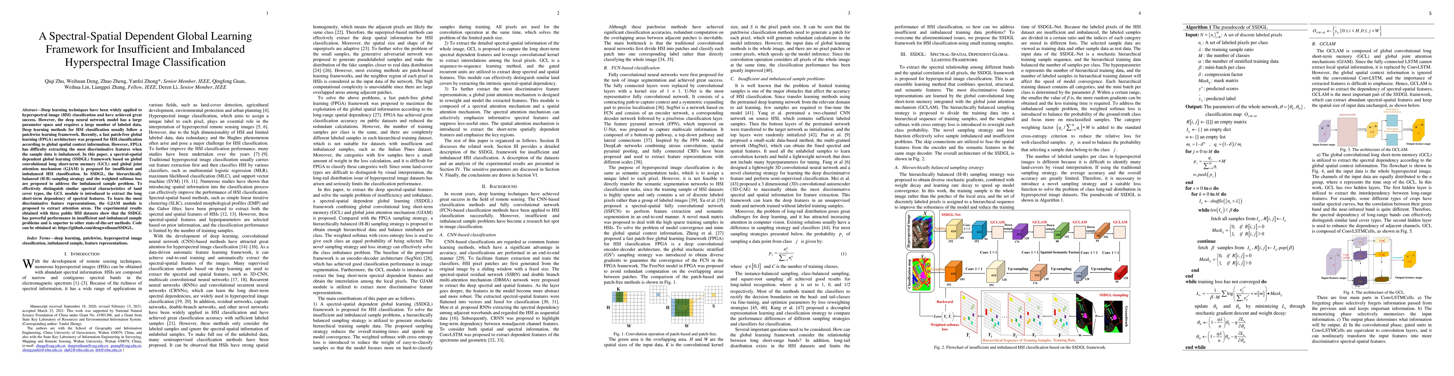 This paper proposes a spectral-spatial dependent global learning (SSDGL) framework for hyperspectral image classification, addressing insufficient and imbalanced data. It integrates global convolutional long short-term memory (GCL) and global joint attention mechanism (GJAM) to improve feature extraction and classification performance, outperforming other state-of-the-art methods on public HSI datasets.