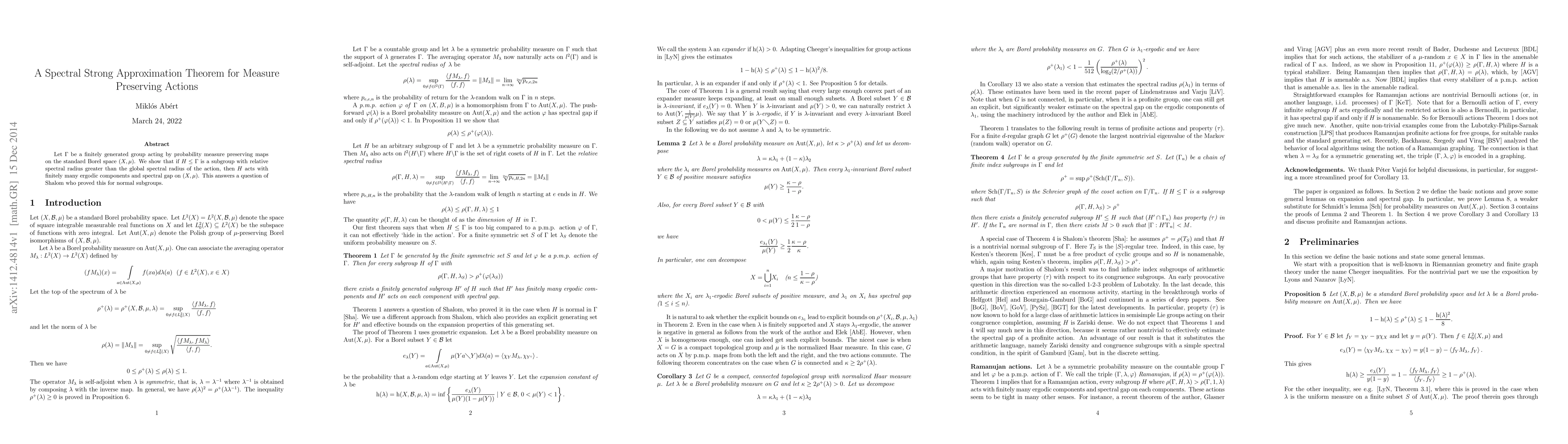Researchers prove a spectral approximation theorem for measure-preserving actions of finitely generated groups, showing that certain subgroups with large relative spectral radius have only finitely many ergodic components.