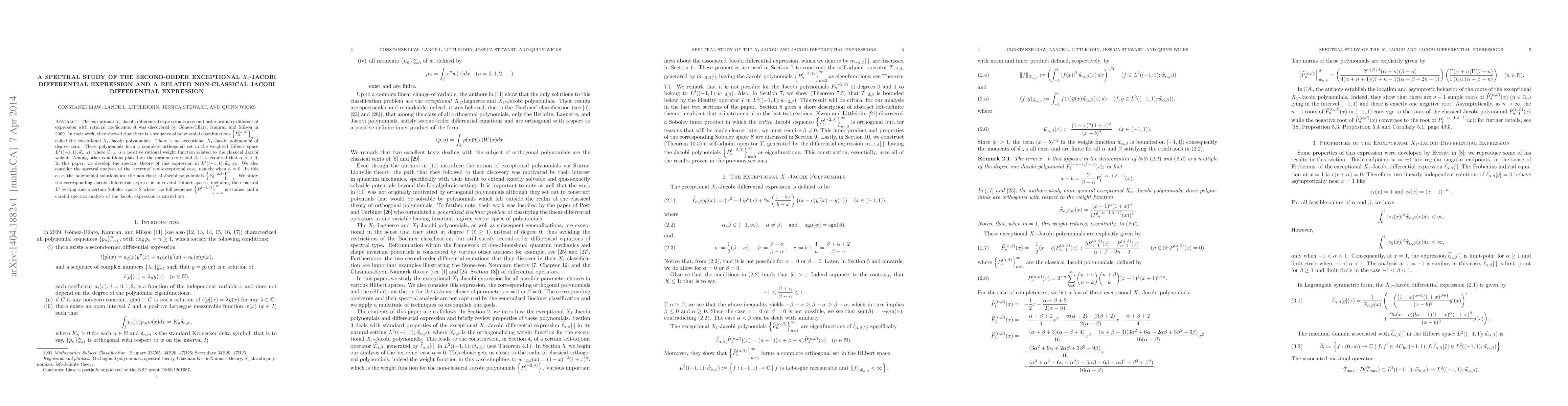 The exceptional $X_{1}$-Jacobi differential expression is a second-order ordinary differential expression with rational coefficients; it was discovered by G\'{o}mez-Ullate, Kamran and Milson in 2009. In their work, they showed that there is a sequence of polynomial eigenfunctions $\left\{\widehat{P} _{n}^{(\alpha,\beta)}\right\}_{n=1}^{\infty}$ called the exceptional $X_{1}$-Jacobi polynomials. There is no exceptional $X_{1}$-Jacobi polynomial of degree zero. These polynomials form a complete orthogonal set in the weighted Hilbert space $L^{2}((-1,1);\widehat{w}_{\alpha,\beta}),$ where $\widehat{w}_{\alpha,\beta}$ is a positive rational weight function related to the classical Jacobi weight. Among other conditions placed on the parameters $\alpha$ and $\beta,$ it is required that $\alpha,\beta>0.$ In this paper, we develop the spectral theory of this expression in $L^{2}((-1,1);\widehat{w}_{\alpha,\beta})$. We also consider the spectral analysis of the `extreme' non-exceptional case, namely when $\alpha=0$. In this case, the polynomial solutions are the non-classical Jacobi polynomials $\left\{ P_{n}^{(-2,\beta)}\right\} _{n=2}^{\infty}.$ We study the corresponding Jacobi differential expression in several Hilbert spaces, including their natural $L^{2}$ setting and a certain Sobolev space $S$ where the full sequence $\left\{ P_{n}^{(-2,\beta)}\right\} _{n=0}^{\infty}$ is studied and a careful spectral analysis of the Jacobi expression is carried out.