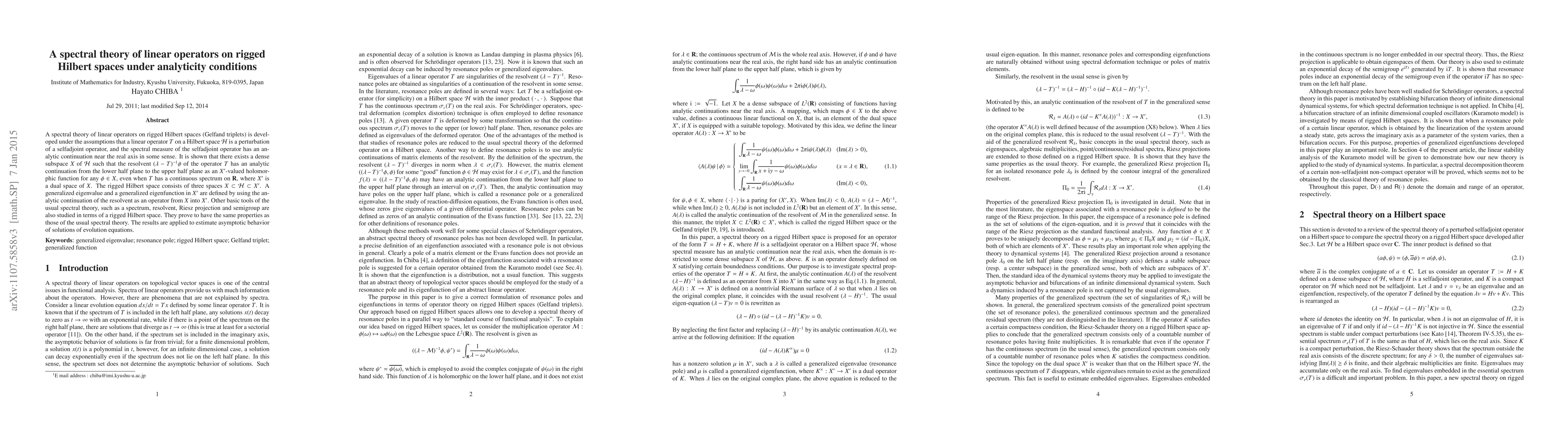 This paper develops a spectral theory for linear operators on rigged Hilbert spaces, showing that under certain analyticity conditions, the resolvent of perturbed selfadjoint operators can be analytically continued across the real axis. The results are applied to estimate the asymptotic behavior of solutions to evolution equations.