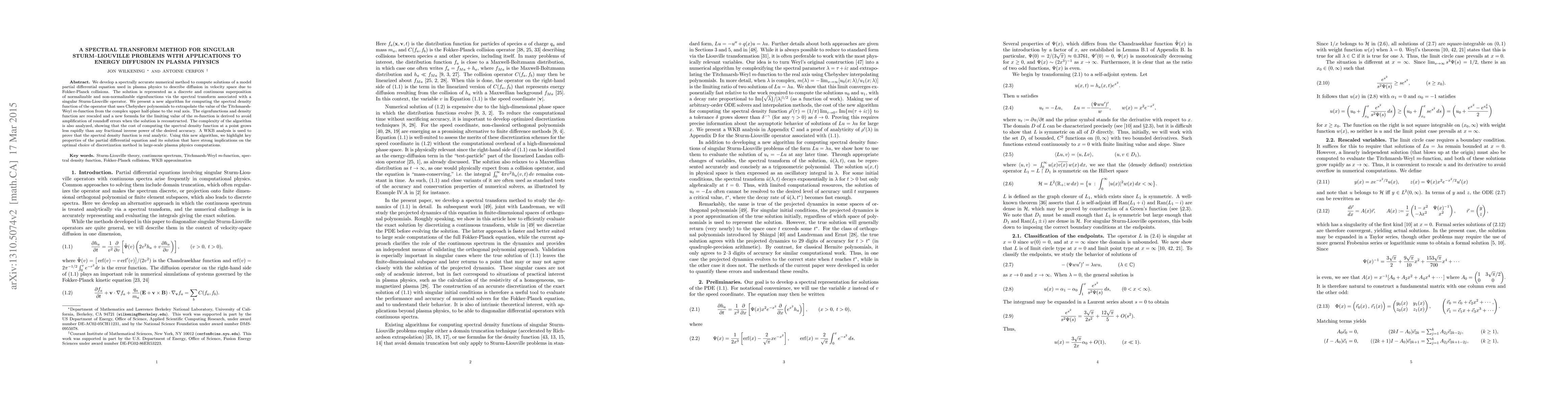 We develop a spectrally accurate numerical method to compute solutions of a model partial differential equation used in plasma physics to describe diffusion in velocity space due to Fokker-Planck collisions. The solution is represented as a discrete and continuous superposition of normalizable and non-normalizable eigenfunctions via the spectral transform associated with a singular Sturm-Liouville operator. We present a new algorithm for computing the spectral density function of the operator that uses Chebyshev polynomials to extrapolate the value of the Titchmarsh-Weyl $m$-function from the complex upper half-plane to the real axis. The eigenfunctions and density function are rescaled and a new formula for the limiting value of the $m$-function is derived to avoid amplification of roundoff errors when the solution is reconstructed. The complexity of the algorithm is also analyzed, showing that the cost of computing the spectral density function at a point grows less rapidly than any fractional inverse power of the desired accuracy. A WKB analysis is used to prove that the spectral density function is real analytic. Using this new algorithm, we highlight key properties of the partial differential equation and its solution that have strong implications on the optimal choice of discretization method in large-scale plasma physics computations.