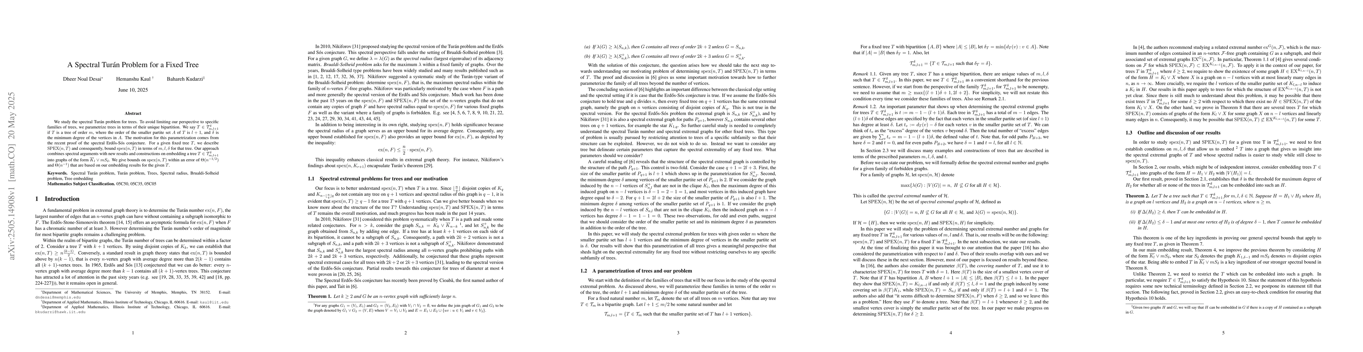 This paper solves the spectral Turan problem for a fixed tree by parametrizing trees in terms of their unique bipartition and embedding them into specific graphs to establish bounds on the spectral edge exponential.