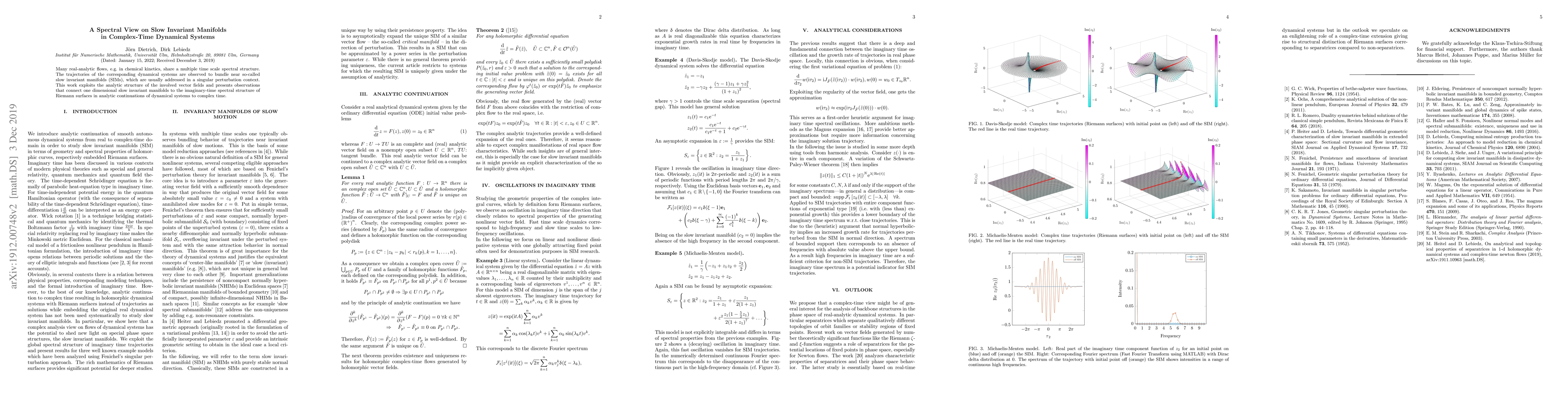 This paper investigates the spectral properties of slow invariant manifolds (SIMs) in real-analytic flows, particularly relating one-dimensional SIMs to the imaginary-time spectral structure of Riemann surfaces via complex-time dynamical systems. It highlights the multiple time scale spectral structure observed near SIMs in applications like chemical kinetics.