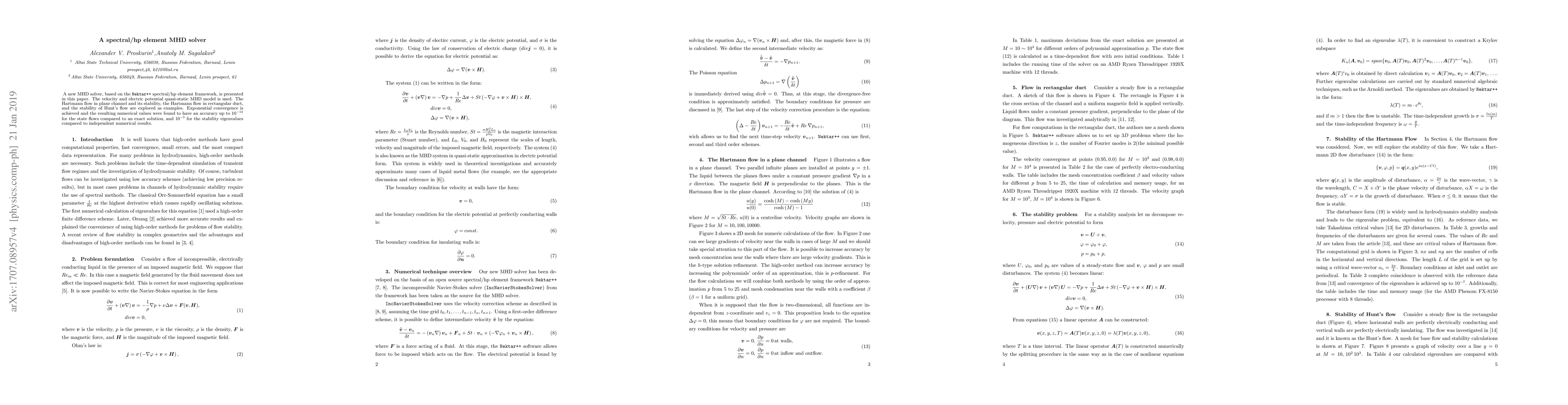This paper introduces a new MHD solver utilizing the Nektar++ spectral/hp element framework, achieving exponential convergence and high accuracy for Hartmann and Hunt's flows, with numerical values accurate up to $10^{-12}$ for state flows and $10^{-5}$ for stability eigenvalues.