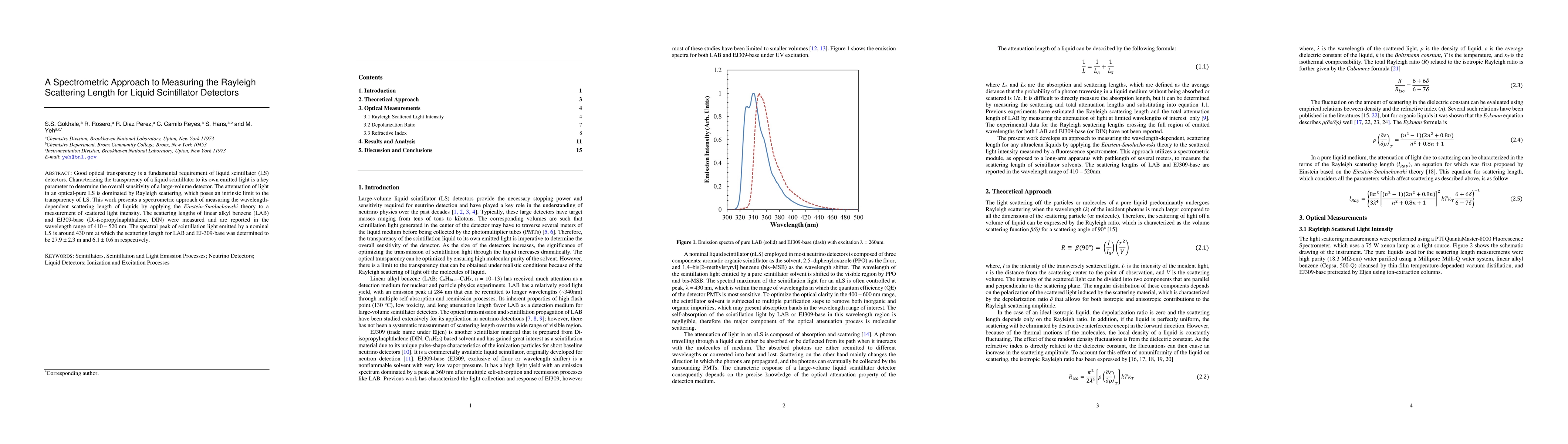 Good optical transparency is a fundamental requirement of liquid scintillator (LS) detectors. Characterizing the transparency of a liquid scintillator to its own emitted light is a key parameter to determine the overall sensitivity of a large-volume detector. The attenuation of light in an optical-pure LS is dominated by Rayleigh scattering, which poses an intrinsic limit to the transparency of LS. This work presents a spectrometric approach of measuring the wavelength-dependent scattering length of liquids by applying the Einstein-Smoluchowski theory to a measurement of scattered light intensity. The scattering lengths of linear alkyl benzene (LAB) and EJ309-base (Di-isopropylnaphthalene, DIN) were measured and are reported in the wavelength range of 410 to 520 nm. The spectral peak of scintillation light emitted by a nominal LS is around 430 nm at which the scattering length for LAB and EJ-309-base was determined to be 27.9 +/- 2.3 m and 6.1 +/- 0.6 m respectively.
