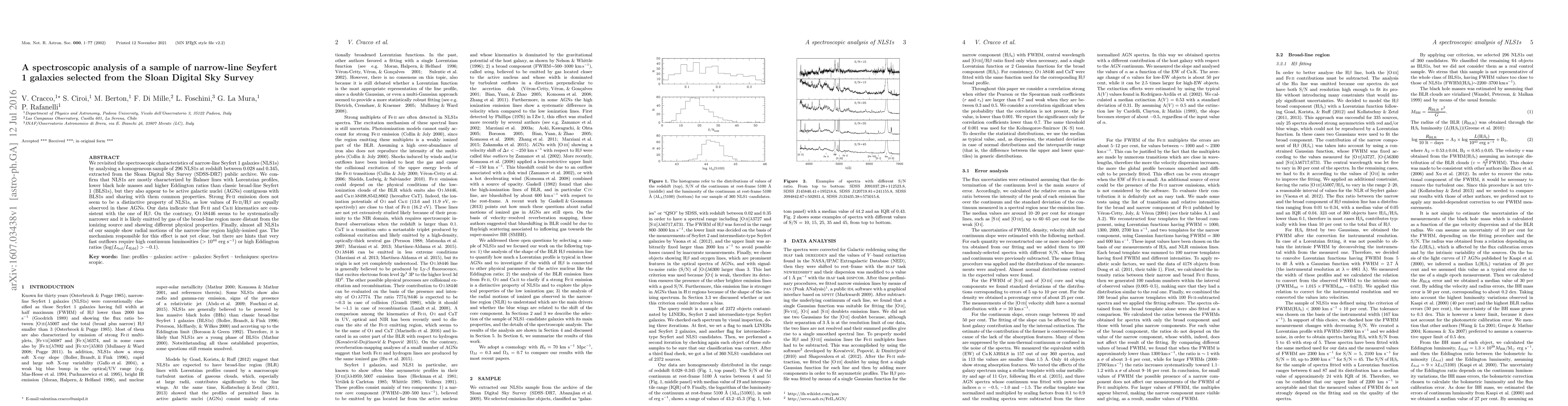 We revisited the spectroscopic characteristics of narrow-line Seyfert 1 galaxies (NLS1s) by analysing a homogeneous sample of 296 NLS1s at redshift between 0.028 and 0.345, extracted from the Sloan Digital Sky Survey (SDSS-DR7) public archive. We confirm that NLS1s are mostly characterized by Balmer lines with Lorentzian profiles, lower black hole masses and higher Eddington ratios than classic broad-line Seyfert 1 (BLS1s), but they also appear to be active galactic nuclei (AGNs) contiguous with BLS1s and sharing with them common properties. Strong Fe II emission does not seem to be a distinctive property of NLS1s, as low values of Fe II/H$\beta$ are equally observed in these AGNs. Our data indicate that Fe II and Ca II kinematics are consistent with the one of H$\beta$. On the contrary, O I $\lambda$8446 seems to be systematically narrower and it is likely emitted by gas of the broad-line region more distant from the ionizing source and showing different physical properties. Finally, almost all NLS1s of our sample show radial motions of the narrow-line region highly-ionised gas. The mechanism responsible for this effect is not yet clear, but there are hints that very fast outflows require high continuum luminosities (> $10^{44}$ erg/s) or high Eddington ratios (log(L$_{\rm bol}$/L$_{\rm Edd}$) > -0.1).