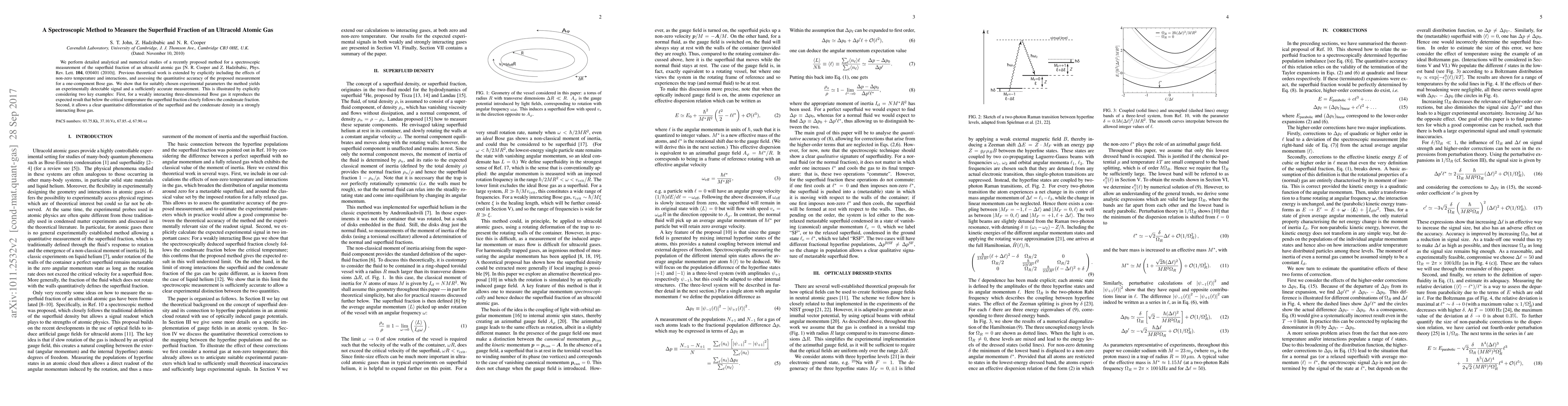 This paper develops a spectroscopic method to measure the superfluid fraction in ultracold atomic gases, extending previous theoretical work by considering non-zero temperature and interactions. The method is shown to yield accurate results for both weakly and strongly interacting Bose gases, providing a clear distinction between superfluid and condensate densities.