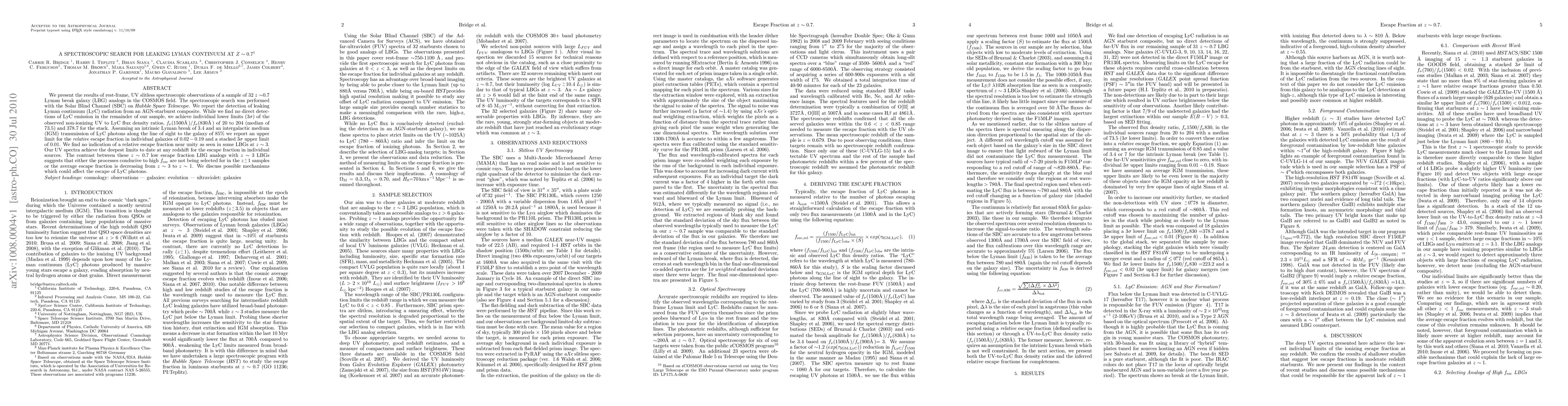 We present the results of rest-frame, UV slitless spectroscopic observations of a sample of 32 z~0.7 Lyman break galaxy (LBG) analogs in the COSMOS field. The spectroscopic search was performed with the Solar Blind Channel (SBC) on Hubble Space Telescope. We report the detection of leaking Lyman continuum (LyC) radiation from an AGN-starburst composite. While we find no direct detections of LyC emission in the remainder of our sample, we achieve individual lower limits (3 sigma) of the observed non-ionizing UV to LyC flux density ratios, f_{nu}(1500A)/f_{nu}(830A) of 20 to 204 (median of 73.5) and 378.7 for the stack. Assuming an intrinsic Lyman break of 3.4 and an intergalactic medium (IGM) transmission of LyC photons along the line of sight to the galaxy of 85% we report an upper limit for the relative escape fraction in individual galaxies of 0.02 - 0.19 and a stacked 3 sigma upper limit of 0.01. We find no indication of a relative escape fraction near unity as seen in some LBGs at z~3. Our UV spectra achieve the deepest limits to date at any redshift for the escape fraction in individual sources. The contrast between these z~0.7 low escape fraction LBG analogs with z~3 LBGs suggests that either the processes conducive to high escape fractions are not being selected for in the z<1 samples or the average escape fraction is decreasing from z~3 to z~1. We discuss possible mechanisms which could affect the escape of LyC photons.
