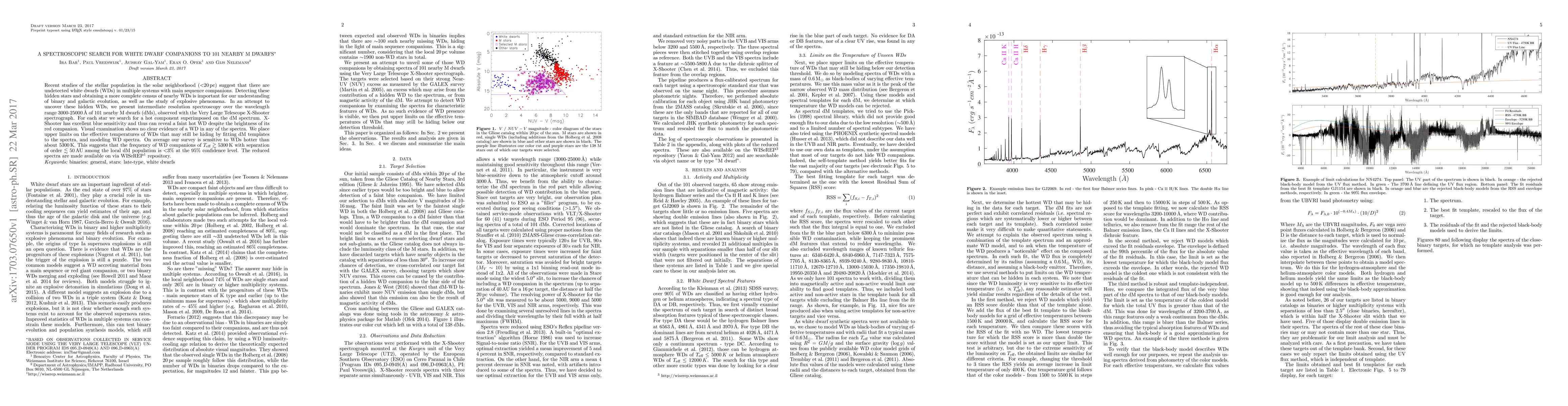 Recent studies of the stellar population in the solar neighborhood (<20 pc) suggest that there are undetected white dwarfs (WDs) in multiple systems with main sequence companions. Detecting these hidden stars and obtaining a more complete census of nearby WDs is important for our understanding of binary and galactic evolution, as well as the study of explosive phenomena. In an attempt to uncover these hidden WDs, we present intermediate resolution spectroscopy over the wavelength range 3000-25000 \AA\ of 101 nearby M dwarfs (dMs), observed with the Very Large Telescope X-Shooter spectrograph. For each star we search for a hot component superimposed on the dM spectrum. X-Shooter has excellent blue sensitivity and thus can reveal a faint hot WD despite the brightness of its red companion. Visual examination shows no clear evidence of a WD in any of the spectra. We place upper limits on the effective temperatures of WDs that may still be hiding by fitting dM templates to the spectra, and modeling WD spectra. On average our survey is sensitive to WDs hotter than about 5300 K. This suggests that the frequency of WD companions of T<5300 K with separation of order <50 AU among the local dM population is <3% at the 95% confidence level. The reduced spectra are made available on via WISeREP repository.