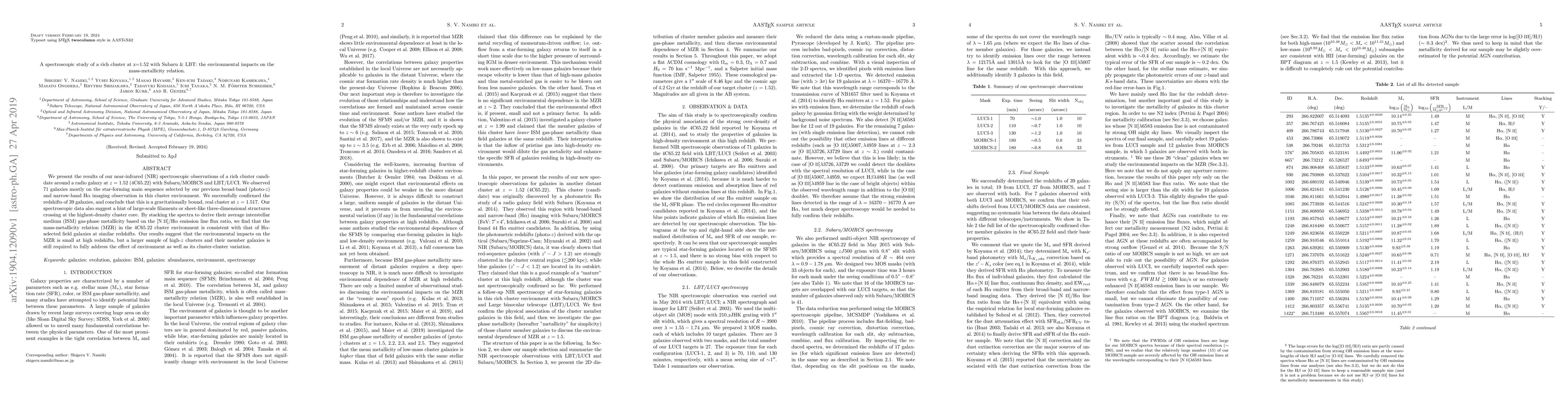 We present the results of our near-infrared (NIR) spectroscopic observations of a rich cluster candidate around a radio galaxy at $z=1.52$ (4C65.22) with Subaru/MOIRCS and LBT/LUCI. We observed 71 galaxies mostly on the star-forming main sequence selected by our previous broad-band (photo-$z$) and narrow-band H$\alpha$ imaging observation in this cluster environment. We successfully confirmed the redshifts of 39 galaxies, and conclude that this is a gravitationally bound, real cluster at $z=1.517$. Our spectroscopic data also suggest a hint of large-scale filaments or sheet-like three-dimensional structures crossing at the highest-density cluster core. By stacking the spectra to derive their average interstellar medium (ISM) gas-phase metallicity based on the [NII]/H$\alpha$ emission line flux ratio, we find that the mass-metallicity relation (MZR) in the 4C65.22 cluster environment is consistent with that of H$\alpha$-selected field galaxies at similar redshifts. Our results suggest that the environmental impacts on the MZR is small at high redshifts, but a larger sample of high-$z$ clusters and their member galaxies is still required to fully address the effect of environment as well as its cluster-cluster variation.