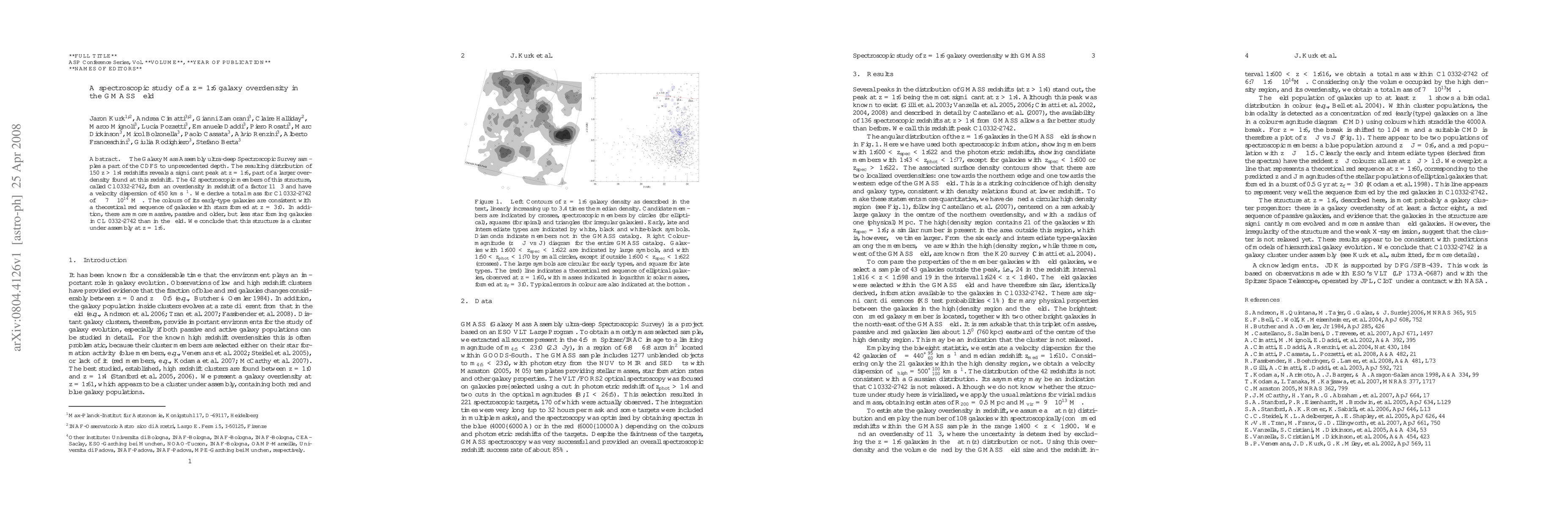 The Galaxy Mass Assembly ultra-deep Spectroscopic Survey samples a part of the CDFS to unprecedented depth. The resulting distribution of 150 z>1.4 redshifts reveals a significant peak at z=1.6, part of a larger overdensity found at this redshift. The 42 spectroscopic members of this structure, called Cl 0332-2742, form an overdensity in redshift of a factor 11+/-3 and have a velocity dispersion of 450 km/s. We derive a total mass for Cl 0332-2742 of ~7x10^14 Msol. The colours of its early-type galaxies are consistent with a theoretical red sequence of galaxies with stars formed at z=3.0. In addition, there are more massive, passive and older, but less star forming galaxies in CL 0332-2742 than in the field. We conclude that this structure is a cluster under assembly at z=1.6.