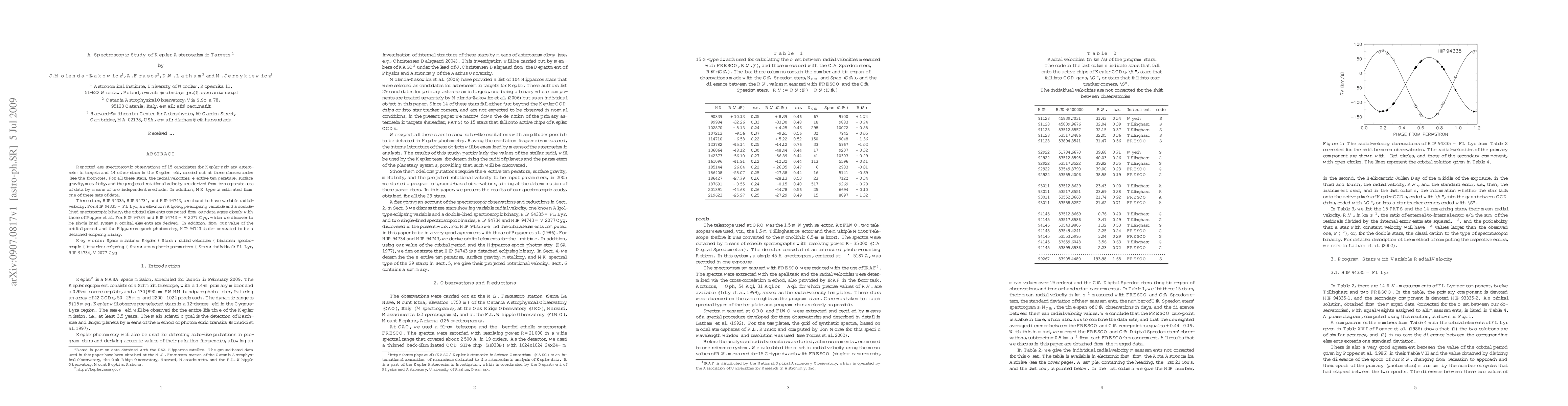 This paper reports spectroscopic observations of 29 Kepler asteroseismic targets and other stars, deriving radial velocities, effective temperature, surface gravity, metallicity, and projected rotational velocity. Three stars are identified as having variable radial velocities, with detailed orbital elements computed for two newly discovered single-lined spectroscopic binaries.