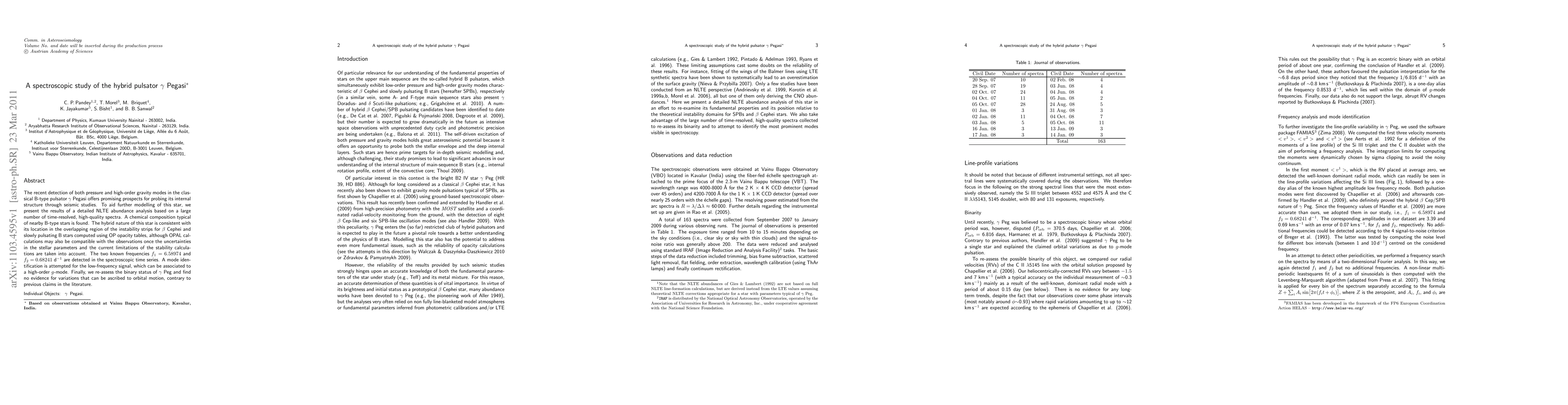 This study investigates the hybrid pulsator Gamma Pegasi, detecting both pressure and high-order gravity modes, and presents a detailed NLTE abundance analysis revealing a typical chemical composition for nearby B-type stars. The star's hybrid nature aligns with its position in the overlapping instability strips for beta Cephei and slowly pulsating B stars.