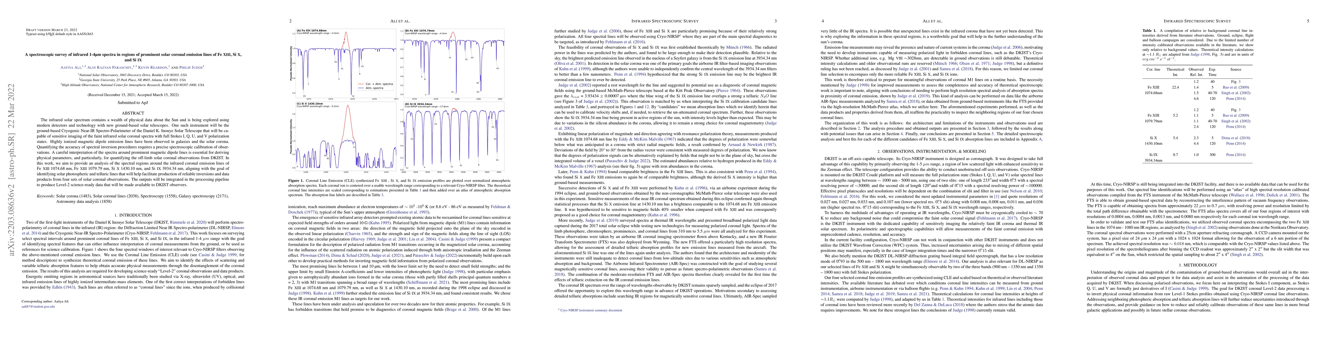 This research paper presents an analysis of spectral regions around infrared coronal emission lines of Fe XIII, Si X, and Si IX in the solar corona. The study aims to identify solar photospheric and telluric lines to facilitate accurate spectral inversions and data production for DKIST observations, contributing to a better understanding of solar coronal physics.