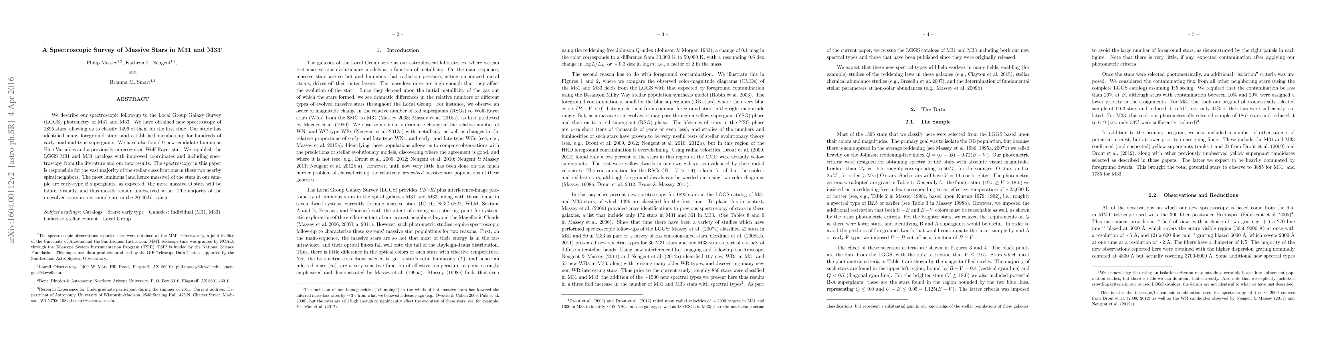 We describe our spectroscopic follow-up to the Local Group Galaxy Survey (LGGS) photometry of M31 and M33. We have obtained new spectroscopy of 1895 stars, allowing us to classify 1496 of them for the first time. Our study has identified many foreground stars, and established membership for hundreds of early- and mid-type supergiants. We have also found 9 new candidate Luminous Blue Variables and a previously unrecognized Wolf-Rayet star. We republish the LGGS M31 and M33 catalogs with improved coordinates and including spectroscopy from the literature and our new results. The spectroscopy in this paper is responsible for the vast majority of the stellar classifications in these two nearby spiral neighbors. The most luminous (and hence massive) of the stars in our sample are early-type B supergiants, as expected; the more massive O stars will be fainter visually, and thus mostly remain unobserved so far. The majority of the unevolved stars in our sample are in the 20-40Mo range.