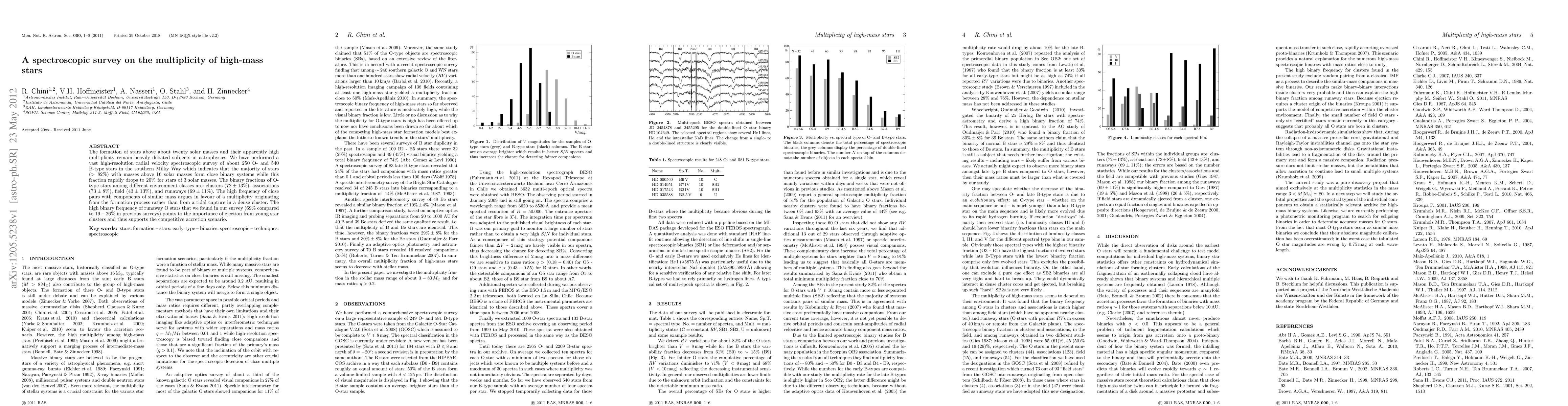 The formation of stars above about twenty solar masses and their apparently high multiplicity remain heavily debated subjects in astrophysics. We have performed a vast high-resolution radial velocity spectroscopic survey of about 250 O- and 540 B-type stars in the southern Milky Way which indicates that the majority of stars (> 82%) with masses above 16 solar masses form close binary systems while this fraction rapidly drops to 20% for stars of 3 solar masses. The binary fractions of O- type stars among different environment classes are: clusters (72 \pm 13%), associations (73 \pm 8%), field (43 \pm 13%), and runaways (69 \pm 11%). The high frequency of close pairs with components of similar mass argues in favour of a multiplicity originating from the formation process rather than from a tidal capture in a dense cluster. The high binary frequency of runaway O stars that we found in our survey (69% compared to 19-26% in previous surveys) points to the importance of ejection from young star clusters and thus supports the competitive accretion scenario.