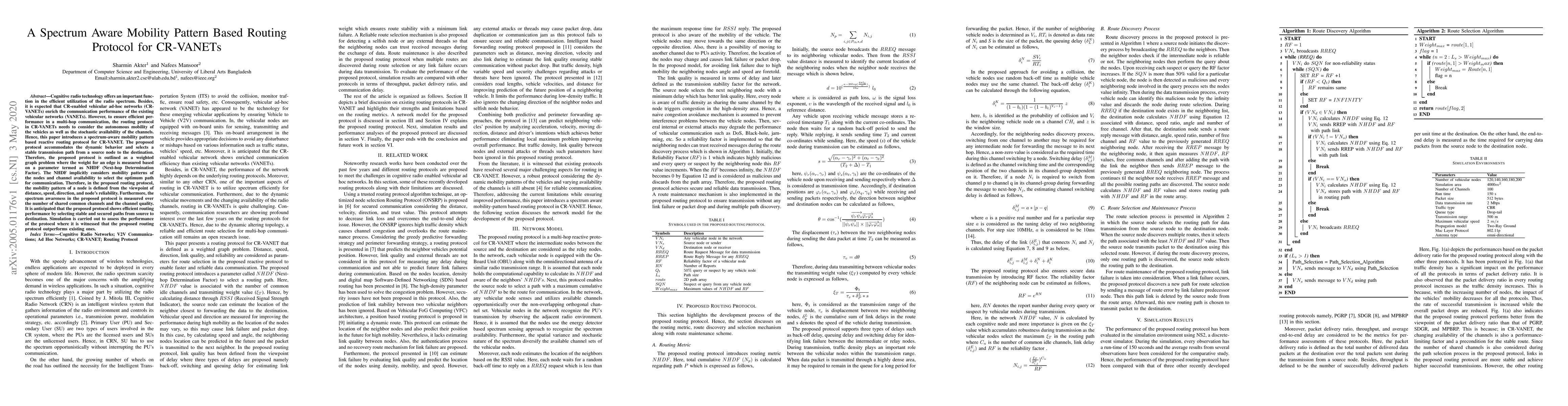 This paper proposes a spectrum-aware mobility pattern based reactive routing protocol for CR-VANETs, which selects stable transmission paths by considering the dynamic mobility patterns and stochastic channel availability. The protocol uses a weighted graph approach where the NHDF factor determines the optimal path, showing improved performance over existing protocols in simulations.