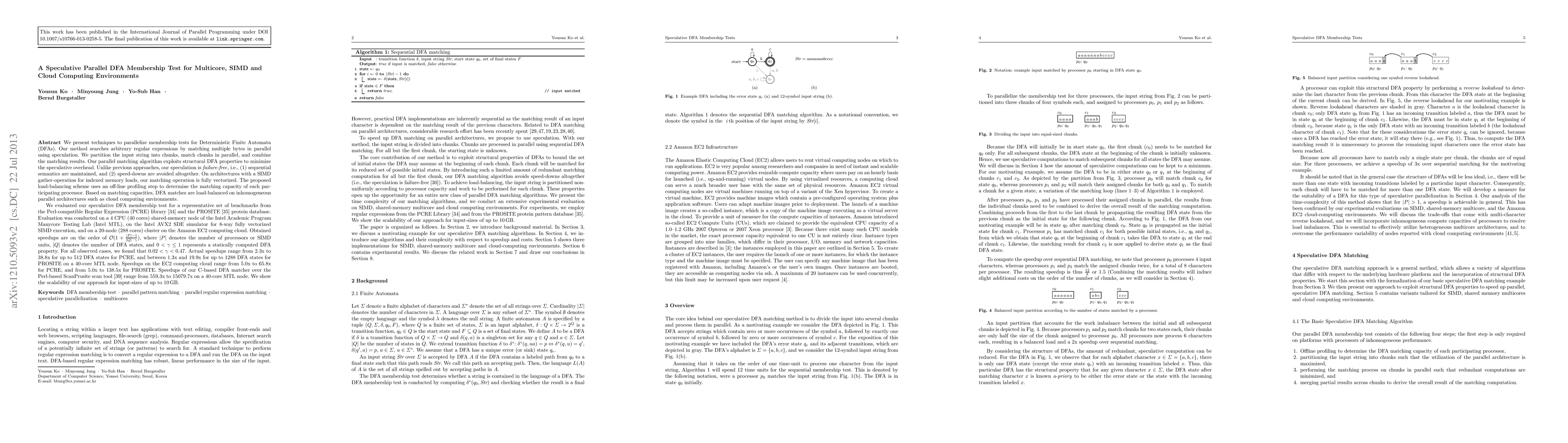 This paper proposes a parallel algorithm for DFA membership tests that leverages multicore, SIMD, and cloud computing environments. The method uses speculative parallel processing to match multiple bytes simultaneously, minimizing overhead and ensuring failure-free speculation, with load balancing tailored for inhomogeneous architectures.