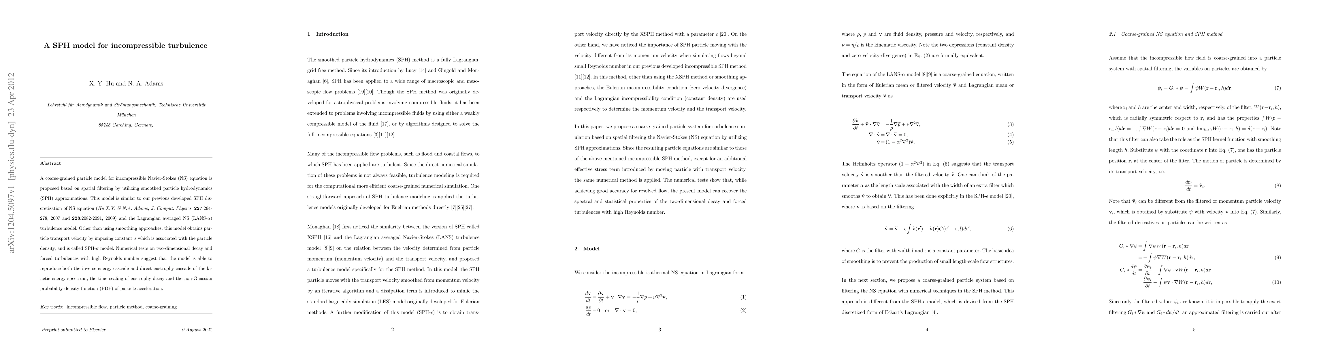 A coarse-grained particle model for incompressible Navier-Stokes (NS) equation is proposed based on spatial filtering by utilizing smoothed particle hydrodynamics (SPH) approximations. This model is similar to our previous developed SPH discretization of NS equation ({\it Hu X.Y. & N.A. Adams, J. Comput. Physics}, 227: 264-278, 2007 and 228: 2082-2091, 2009) and the Lagrangian averaged NS (LANS-$\alpha$) turbulence model. Other than using smoothing approaches, this model obtains particle transport velocity by imposing constant $\sigma$ which is associated with the particle density, and is called SPH-$\sigma$ model. Numerical tests on two-dimensional decay and forced turbulences with high Reynolds number suggest that the model is able to reproduce both the inverse energy cascade and direct enstrophy cascade of the kinetic energy spectrum, the time scaling of enstrophy decay and the non-Guassian probability density function (PDF) of particle acceleration.