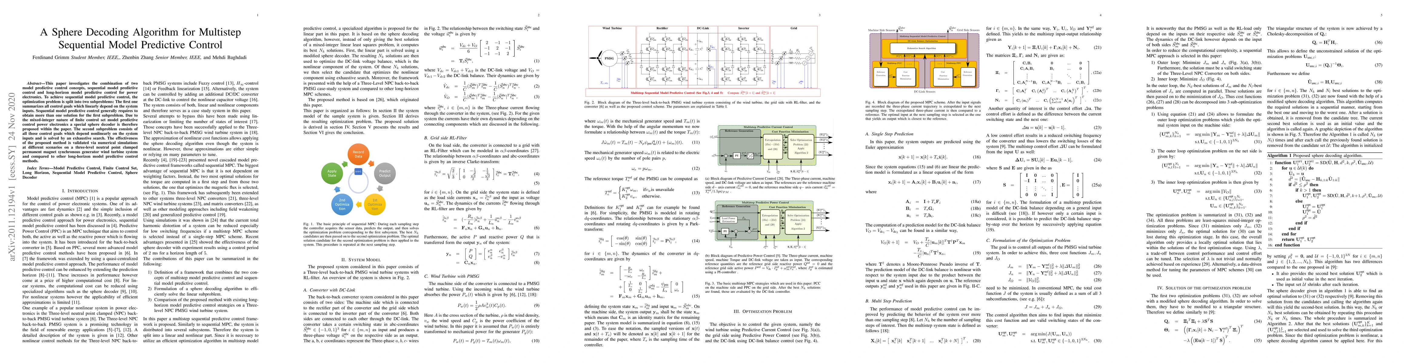 This paper proposes a sphere decoding algorithm for sequential model predictive control in power electronics, combining it with long-horizon model predictive control. The method splits the optimization into two subproblems, solving the first with a specialized sphere decoder and the second via exhaustive search, validated through simulations on a wind turbine system.