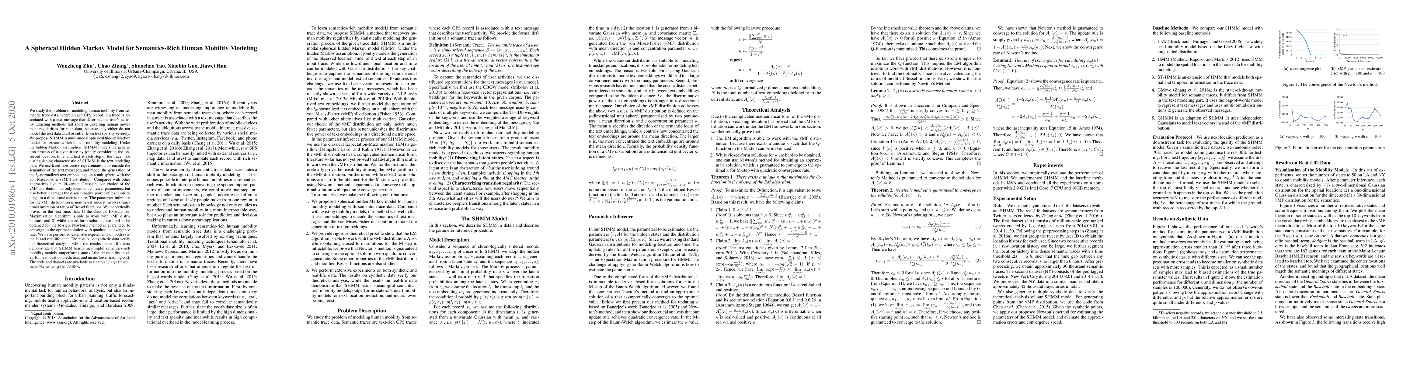 We study the problem of modeling human mobility from semantic trace data, wherein each GPS record in a trace is associated with a text message that describes the user's activity. Existing methods fall short in unveiling human movement regularities, because they either do not model the text data at all or suffer from text sparsity severely. We propose SHMM, a multi-modal spherical hidden Markov model for semantics-rich human mobility modeling. Under the hidden Markov assumption, SHMM models the generation process of a given trace by jointly considering the observed location, time, and text at each step of the trace. The distinguishing characteristic of SHMM is the text modeling part. We use fixed-size vector representations to encode the semantics of the text messages, and model the generation of the l2-normalized text embeddings on a unit sphere with the von Mises-Fisher (vMF) distribution. Compared with other alternatives like multi-variate Gaussian, our choice of the vMF distribution not only incurs much fewer parameters, but also better leverages the discriminative power of text embeddings in a directional metric space. The parameter inference for the vMF distribution is non-trivial since it involves functional inversion of ratios of Bessel functions. We theoretically prove that: 1) the classical Expectation-Maximization algorithm can work with vMF distributions; and 2) while closed-form solutions are hard to be obtained for the M-step, Newton's method is guaranteed to converge to the optimal solution with quadratic convergence rate. We have performed extensive experiments on both synthetic and real-life data. The results on synthetic data verify our theoretical analysis; while the results on real-life data demonstrate that SHMM learns meaningful semantics-rich mobility models, outperforms state-of-the-art mobility models for next location prediction, and incurs lower training cost.