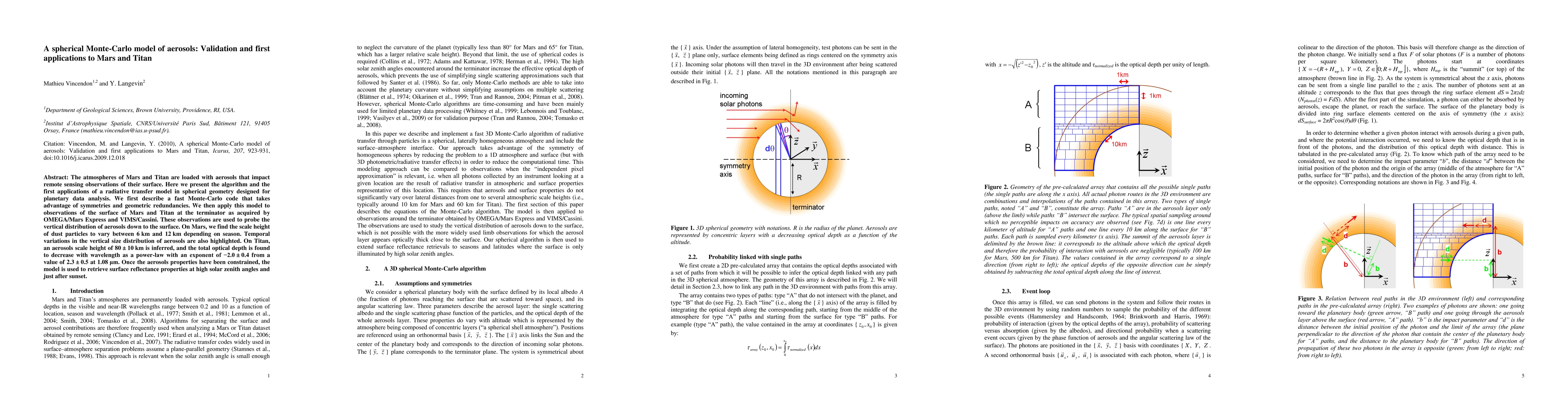 This paper introduces a spherical Monte-Carlo radiative transfer model for analyzing Martian and Titanian aerosols, validated through observations by OMEGA and VIMS. The model reveals variable Martian dust scale heights and temporal aerosol size variations, while Titan's aerosols show a high scale height and wavelength-dependent optical depth.