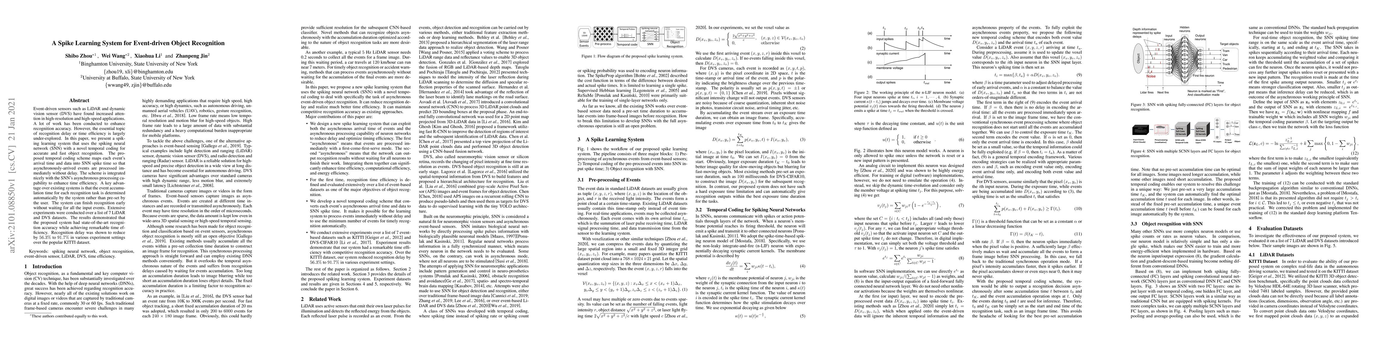 This paper introduces a spiking learning system utilizing a spiking neural network (SNN) with a novel temporal coding scheme for fast and accurate event-driven object recognition. The system dynamically determines event accumulation time, significantly reducing recognition delay by 56.3% to 91.7% on the KITTI dataset while achieving state-of-the-art recognition accuracy.