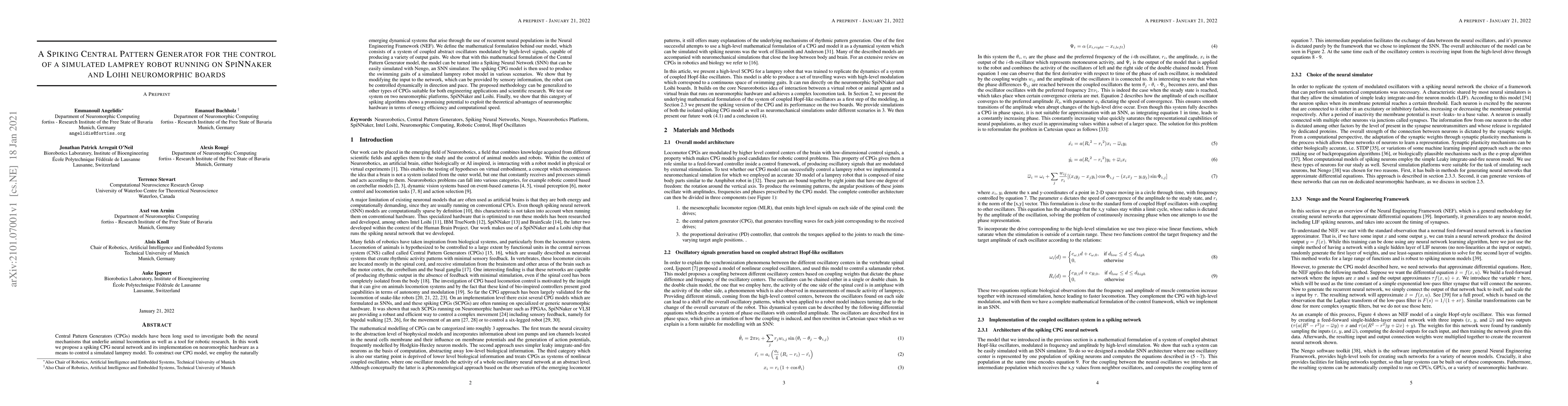 This paper proposes a spiking Central Pattern Generator (CPG) neural network implemented on neuromorphic hardware to control a simulated lamprey robot. The CPG model, formulated as a system of coupled abstract oscillators, is shown to produce various swimming gaits and can be dynamically controlled by sensory inputs. The model is tested on SpiNNaker and Loihi neuromorphic platforms, demonstrating energy efficiency and computational speed advantages.