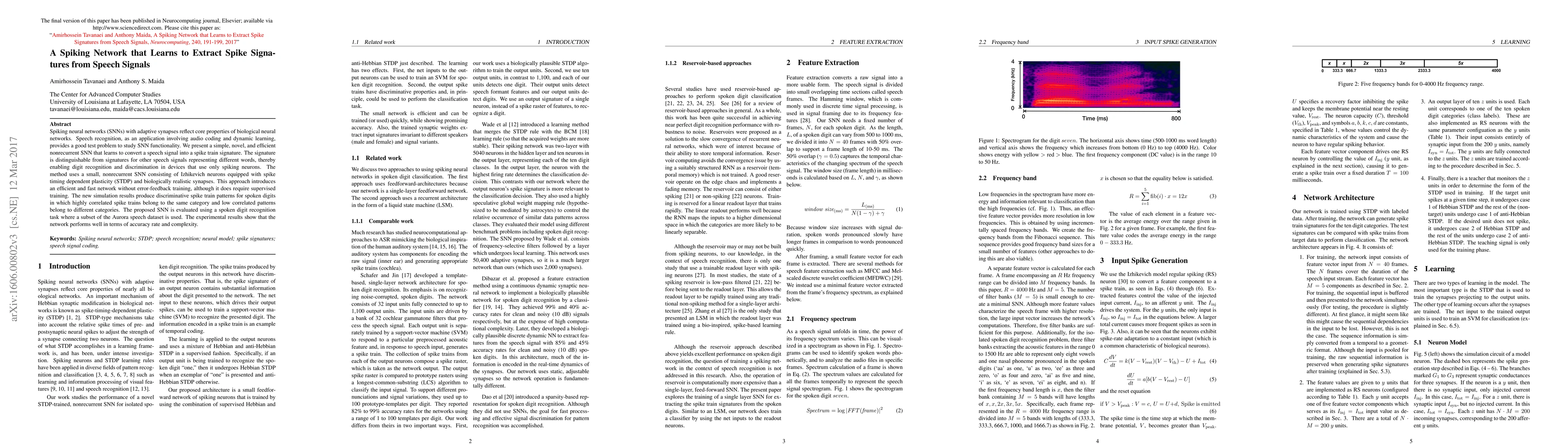 This paper presents a novel nonrecurrent spiking neural network (SNN) that learns to extract distinctive spike train signatures from speech signals, enabling digit recognition. The SNN, composed of Izhikevich neurons with spike timing dependent plasticity, achieves high accuracy and low complexity in a spoken digit recognition task using the Aurora dataset.
