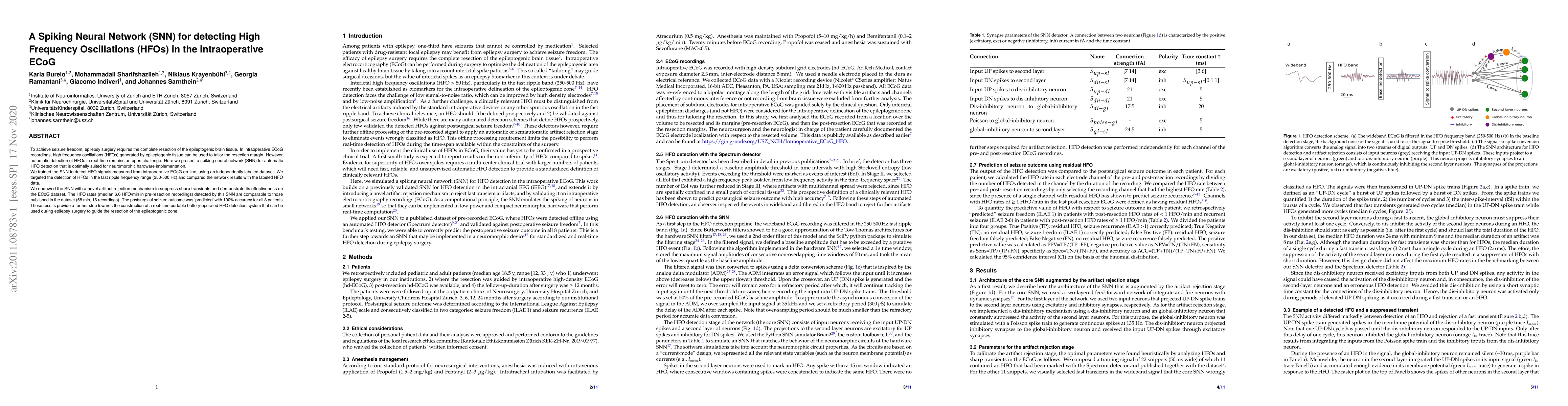 To achieve seizure freedom, epilepsy surgery requires the complete resection of the epileptogenic brain tissue. In intraoperative ECoG recordings, high frequency oscillations (HFOs) generated by epileptogenic tissue can be used to tailor the resection margin. However, automatic detection of HFOs in real-time remains an open challenge. Here we present a spiking neural network (SNN) for automatic HFO detection that is optimally suited for neuromorphic hardware implementation. We trained the SNN to detect HFO signals measured from intraoperative ECoG on-line, using an independently labeled dataset. We targeted the detection of HFOs in the fast ripple frequency range (250-500 Hz) and compared the network results with the labeled HFO data. We endowed the SNN with a novel artifact rejection mechanism to suppress sharp transients and demonstrate its effectiveness on the ECoG dataset. The HFO rates (median 6.6 HFO/min in pre-resection recordings) detected by this SNN are comparable to those published in the dataset (58 min, 16 recordings). The postsurgical seizure outcome was "predicted" with 100% accuracy for all 8 patients. These results provide a further step towards the construction of a real-time portable battery-operated HFO detection system that can be used during epilepsy surgery to guide the resection of the epileptogenic zone.