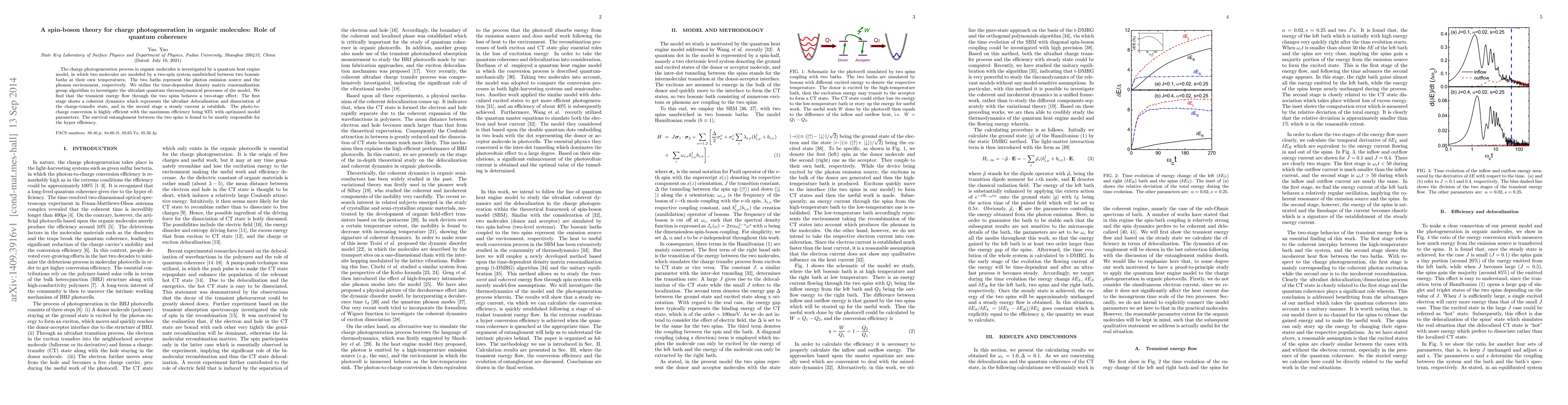 The charge photogeneration process in organic molecules is investigated by a quantum heat engine model, in which two molecules are modeled by a two-spin system sandwiched between two bosonic baths at their own temperatures. The two baths represent the photon emission source and the phonon environment, respectively. We utilize the time-dependent density matrix renormalization group algorithm to investigate the ultrafast quantum thermodynamical processes of the model. We find that the transient energy flow through the two spins behaves a two-stage effect: The first stage shows a coherent dynamics which represents the ultrafast delocalization and dissociation of the charge-transfer state, and in the second stage a steady current is establish. The photo-to-charge conversion is highly efficient with the maximum efficiency being $93\%$ with optimized model parameters. The survival entanglement between the two spins is found to be mostly responsible for the hyper efficiency.