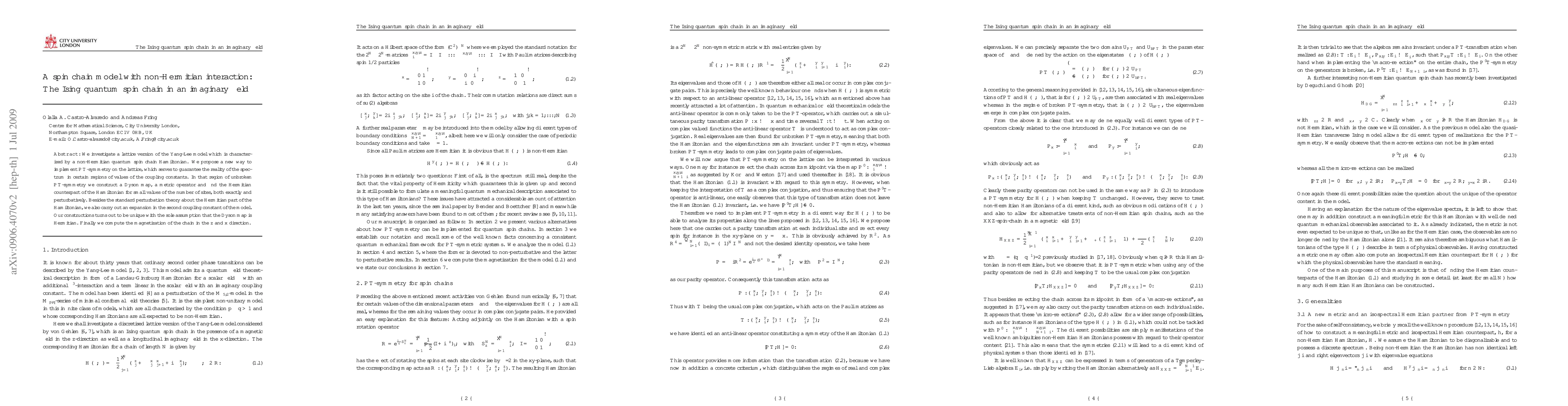 We investigate a lattice version of the Yang-Lee model which is characterized by a non-Hermitian quantum spin chain Hamiltonian. We propose a new way to implement PT-symmetry on the lattice, which serves to guarantee the reality of the spectrum in certain regions of values of the coupling constants. In that region of unbroken PT-symmetry we construct a Dyson map, a metric operator and find the Hermitian counterpart of the Hamiltonian for small values of the number of sites, both exactly and perturbatively. Besides the standard perturbation theory about the Hermitian part of the Hamiltonian, we also carry out an expansion in the second coupling constant of the model. Our constructions turns out to be unique with the sole assumption that the Dyson map is Hermitian. Finally we compute the magnetization of the chain in the z and x direction.