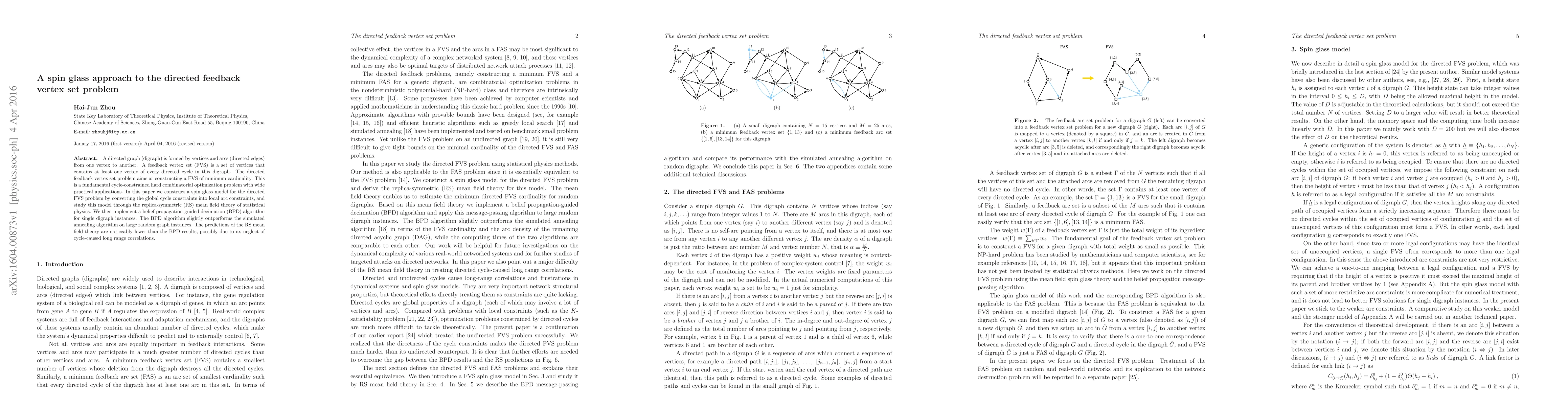 This paper proposes a spin glass model for solving the directed feedback vertex set problem, converting global cycle constraints into local arc constraints, and uses replica-symmetric mean field theory and a belief propagation-guided decimation algorithm to find optimal solutions. The BPD algorithm shows better performance than simulated annealing on large random graphs.
