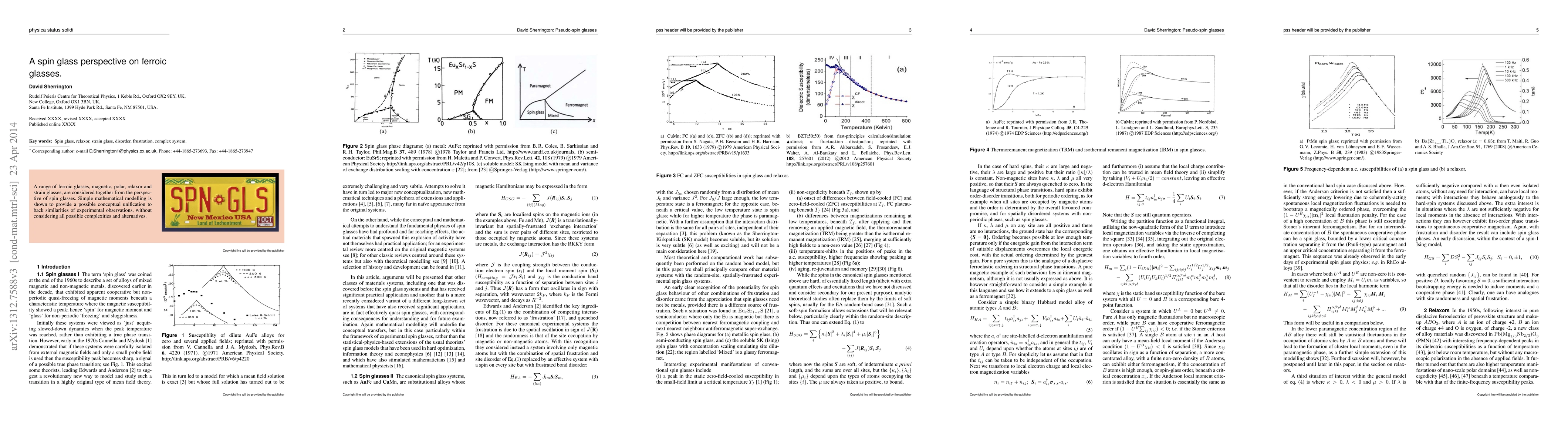 A range of ferroic glasses, magnetic, polar, relaxor and strain glasses, are considered together from the perspective of spin glasses. Simple mathematical modelling is shown to provide a possible conceptual unification to back similarities of experimental observations, without considering all possible complexities and alternatives.