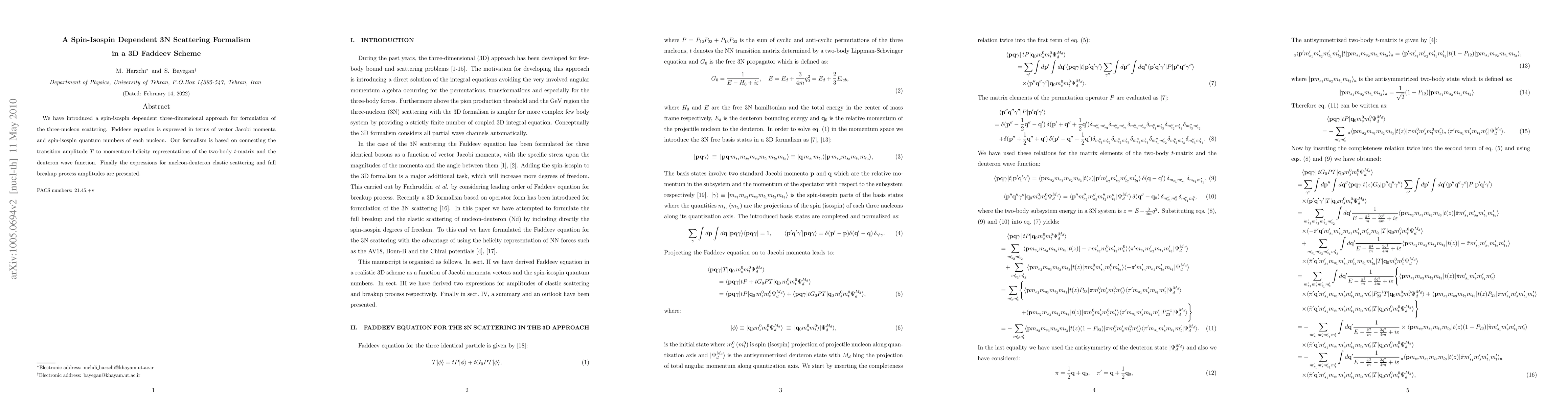 We have introduced a spin-isospin dependent three-dimensional approach for formulation of the three-nucleon scattering. Faddeev equation is expressed in terms of vector Jacobi momenta and spin-isospin quantum numbers of each nucleon. Our formalism is based on connecting the transition amplitude $T$ to momentum-helicity representations of the two-body $t$-matrix and the deuteron wave function. Finally the expressions for nucleon-deuteron elastic scattering and full breakup process amplitudes are presented.