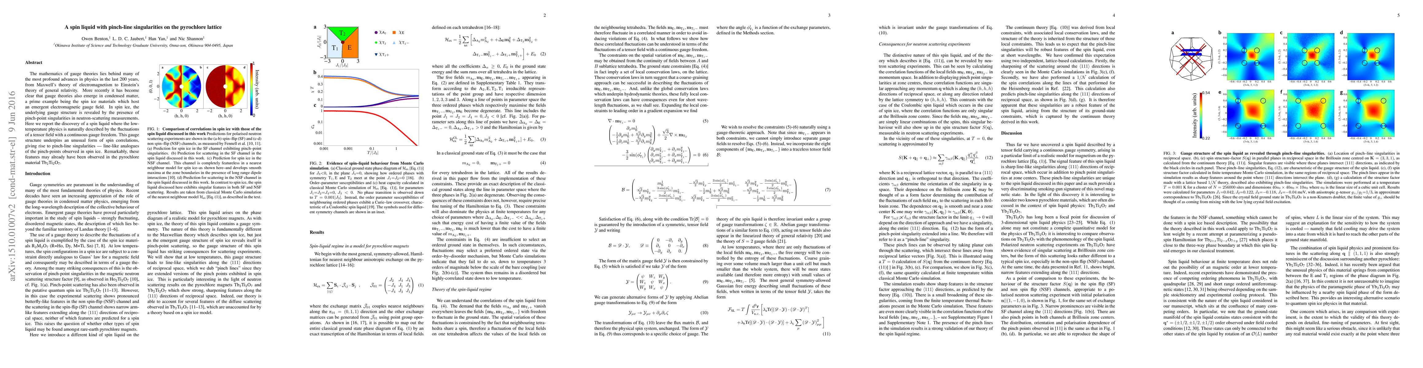 This paper reports the discovery of a spin liquid on the pyrochlore lattice characterized by pinch-line singularities, analogous to pinch-points in spin ice, indicating a continuous gauge field and potentially observed in Tb$_2$Ti$_2$O$_7$. These findings highlight the emergence of gauge theories in condensed matter physics.