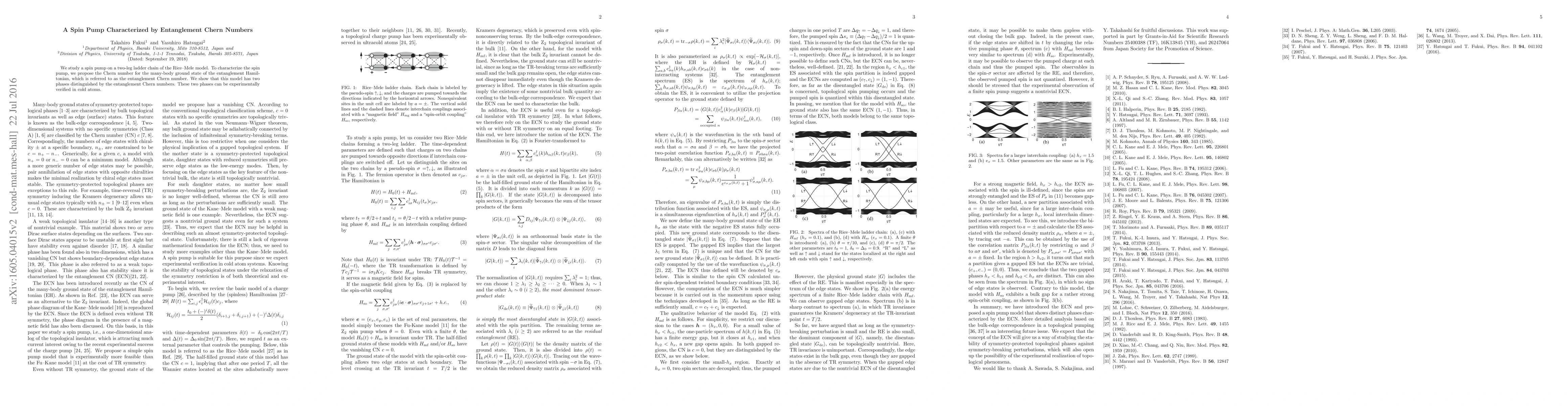 This paper investigates a spin pump in a two-leg ladder chain using the Rice-Mele model, introducing the entanglement Chern number to characterize the many-body ground state. It reveals two distinct phases based on these numbers, which can be confirmed experimentally with cold atoms.