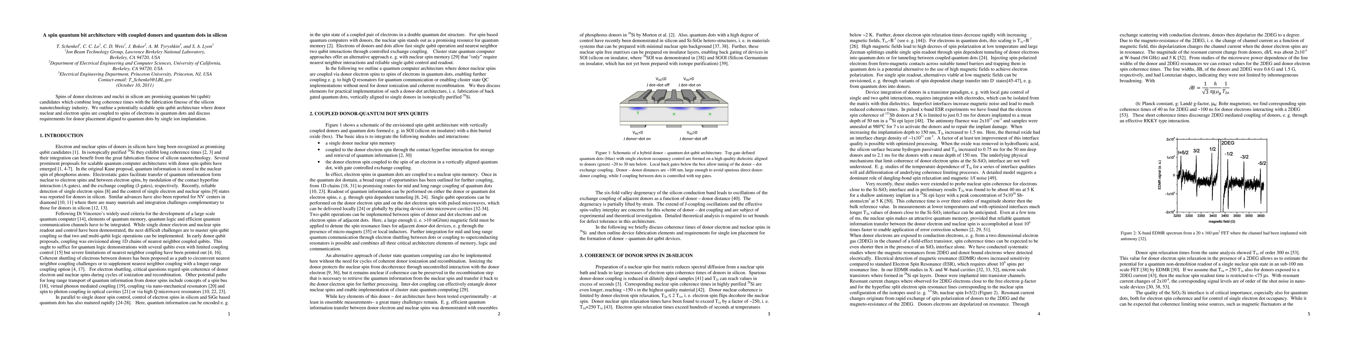 This paper proposes a scalable spin qubit architecture in silicon using coupled donor electrons and nuclei with quantum dots, leveraging long coherence times and silicon nanotechnology for fabrication. It discusses the alignment requirements for donor placement via single ion implantation to achieve optimal coupling.