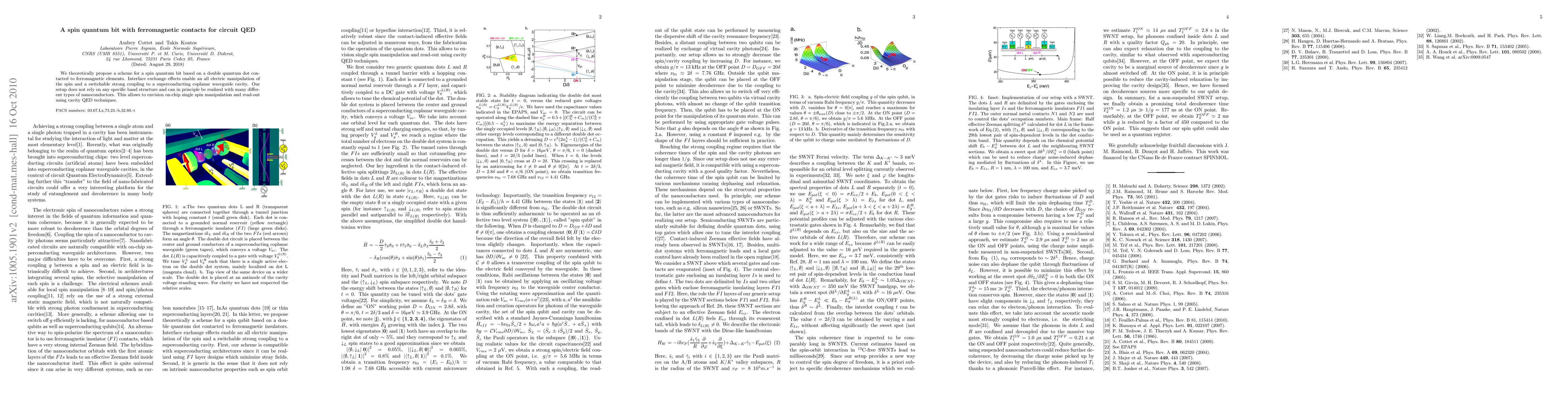 This paper proposes a spin quantum bit scheme utilizing double quantum dots connected to ferromagnetic contacts, enabling all-electric spin manipulation and switchable strong coupling to a superconducting cavity, with potential for versatile nanoconductor implementations and on-chip single spin operations via cavity QED.