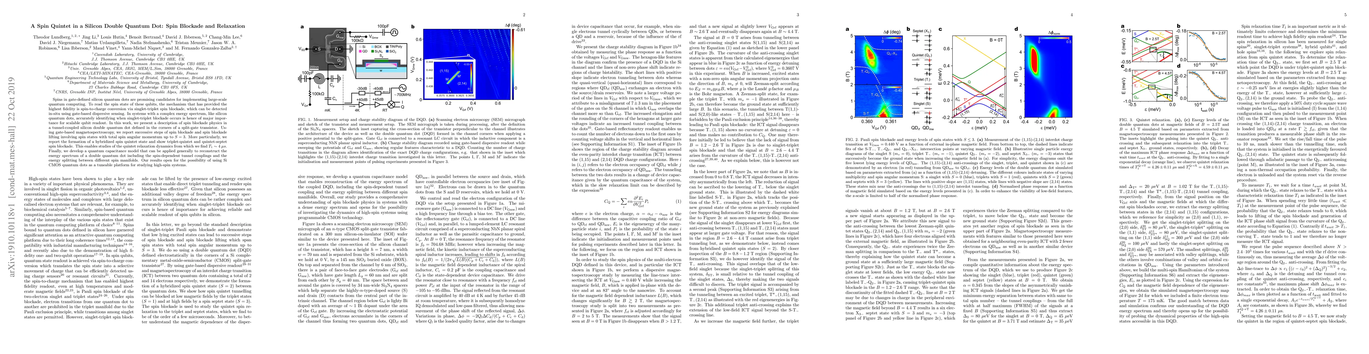 This paper investigates spin blockade physics in a silicon double quantum dot, demonstrating spin quintet formation and blockade dynamics. The study reveals quintet relaxation dynamics with a time constant of $T_1 \sim 4 ~\mu s$ and develops a quantum capacitance model for the energy spectrum reconstruction of the double quantum dot.