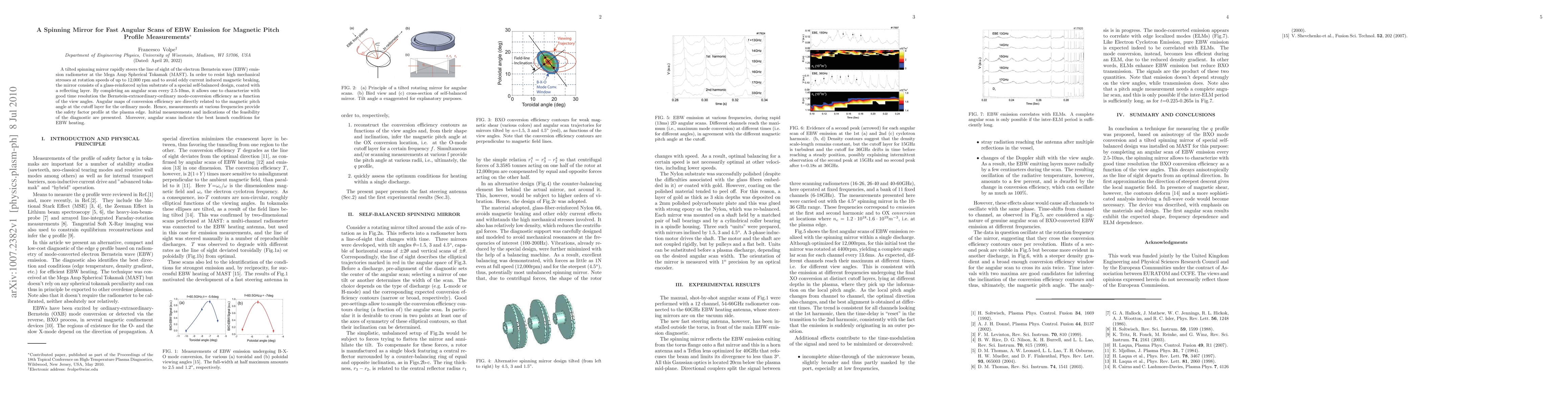 A tilted spinning mirror rapidly steers the line of sight of the electron Bernstein wave (EBW) emission radiometer at the Mega Amp Spherical Tokamak (MAST). In order to resist high mechanical stresses at rotation speeds of up to 12,000 rpm and to avoid eddy current induced magnetic braking, the mirror consists of a glass-reinforced nylon substrate of a special self-balanced design, coated with a reflecting layer. By completing an angular scan every 2.5-10ms, it allows one to characterize with good time resolution the Bernstein-extraordinary-ordinary mode-conversion efficiency as a function of the view angles. Angular maps of conversion efficiency are directly related to the magnetic pitch angle at the cutoff layer for the ordinary mode. Hence, measurements at various frequencies provide the safety factor profile at the plasma edge. Initial measurements and indications of the feasibility of the diagnostic are presented. Moreover, angular scans indicate the best launch conditions for EBW heating.